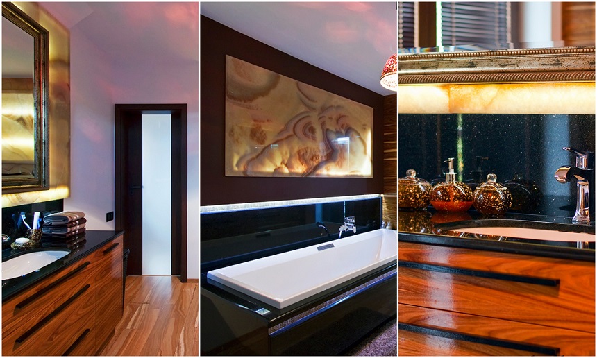 Ich w ostatnim czasie nieco u nas przybyło. Zdecydowaliśmy się na mozaikę, która odmieniła oblicze naszej smutnej toalety, a także imitację cegły która sprawiła, że w moim domowym gabinecie w końcu zachciało mi się pracować. Jednak okładzina, która naprawdę robi wrażenie jest w naszej dużej łazience w postaci wyjątkowego kamienia, który jako jedyny z istniejących – przepuszcza światło. ONYX – bo o nim mowa robi nam zarówno za oświetlenie jak i obraz. Lubię również granitowy łupek który ozdabia naszą “telewizyjną ścianę”. Walory tej formy garnitu dostrzegamy szczególnie wieczorami kiedy kamień mieni się na wszystkie strony dzięki oświetleniu telewizora.