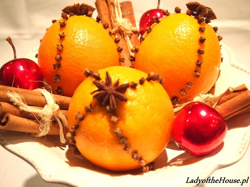 Tak to jest, że mandarynki i pomarańcze już zawsze będą się kojarzyły naszym Rodzicom ze świętami Bożego Narodzenia. Dla mnie pomarańcze w połączeniu z gozdzikami to szalenie efektowna ozdoba, której nie powinno zabraknąć w żadnym domu. Ta dekoracja zapewnia niezwykle aromatyczny zapach w pomieszczeniu a przy odrobinie kreatywności ucieszy oko każdego wielbiciela świąt.