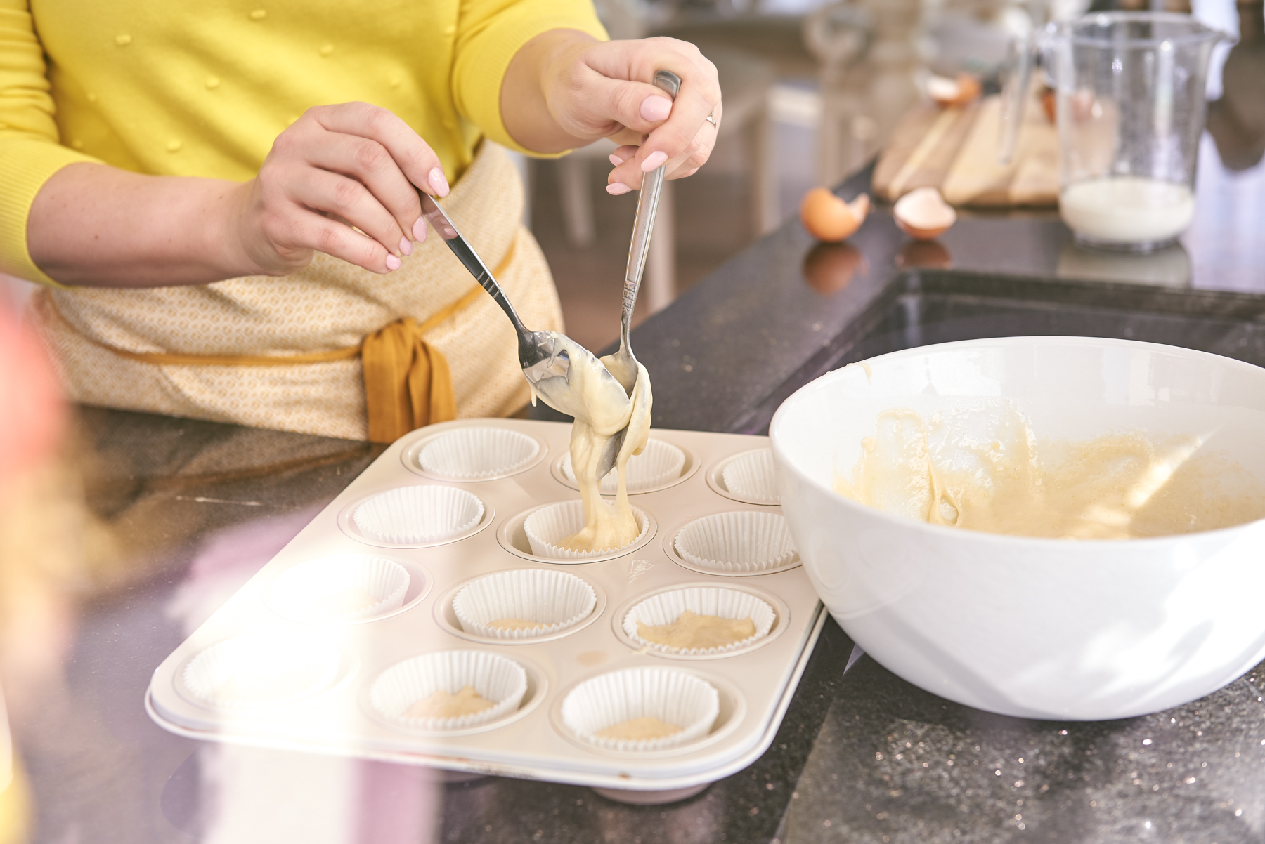 - Formę muffinkową wykładamy papilotkami i przekładamy do niej ciasto.