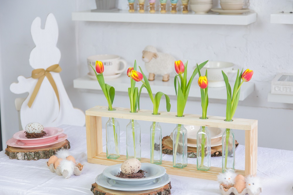 Zamiast klasycznego bukietu, zdecydowałam się na podłużny kwietnik, który wykonałam własnoręcznie i oprócz tego, że jest idealnie dopasowany do rozmiarów mojego stołu, to na dodatek pochłania tylko niezbędną ilość miejsca. Stanowiąc jednocześnie bardzo efektowny akcent Wiosenno-Wielkanocnego stołu. Do jego wykonania potrzebne mi były czyste deski po euro-paletach, które wcześniej odpowiednio oszlifowałam i przycięłam (celowo nie podaję Wam rozmiarów gdyż powinny one zostać dopasowane do ilości butelek-flakoników na które się zdecydujecie i wielkości stołu).