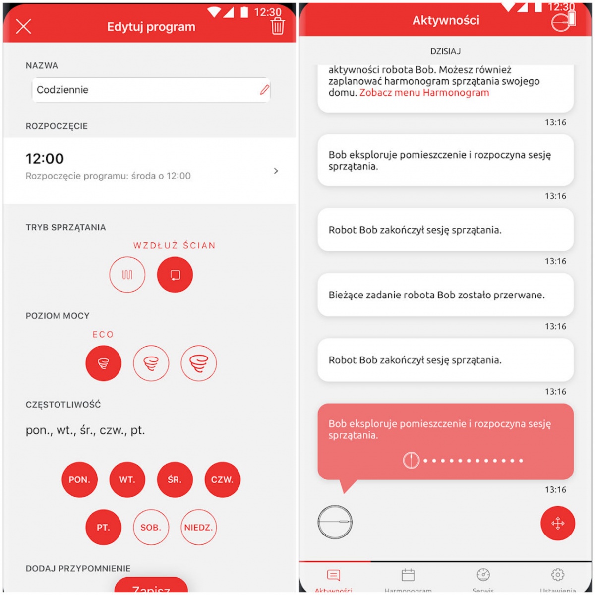 •   Sterowany telefonem Z pomocą aplikacji “Tefal Robots” na telefonie można sterować pracą odkurzacza z dowolnego miejsca np. będąc poza domem możemy włączyć odkurzacz, aby po naszym powrocie w domu było czysto. Możemy także zaplanować sesję sprzątania w wybrane dni tygodnia i o wybranej godzinie – nie musimy więc pamiętać, żeby włączyć robota – uruchomi się automatycznie i posprząta za nas. Aplikacja pozwala także nadać imię naszemu robotowi, przez co dosyć szybko się zaprzyjaźniliśmy;) Możemy także monitorować pracę robota i w razie potrzeby sprawdzić szczegółowe informacje techniczne np. dotyczące wymiany akcesoriów.