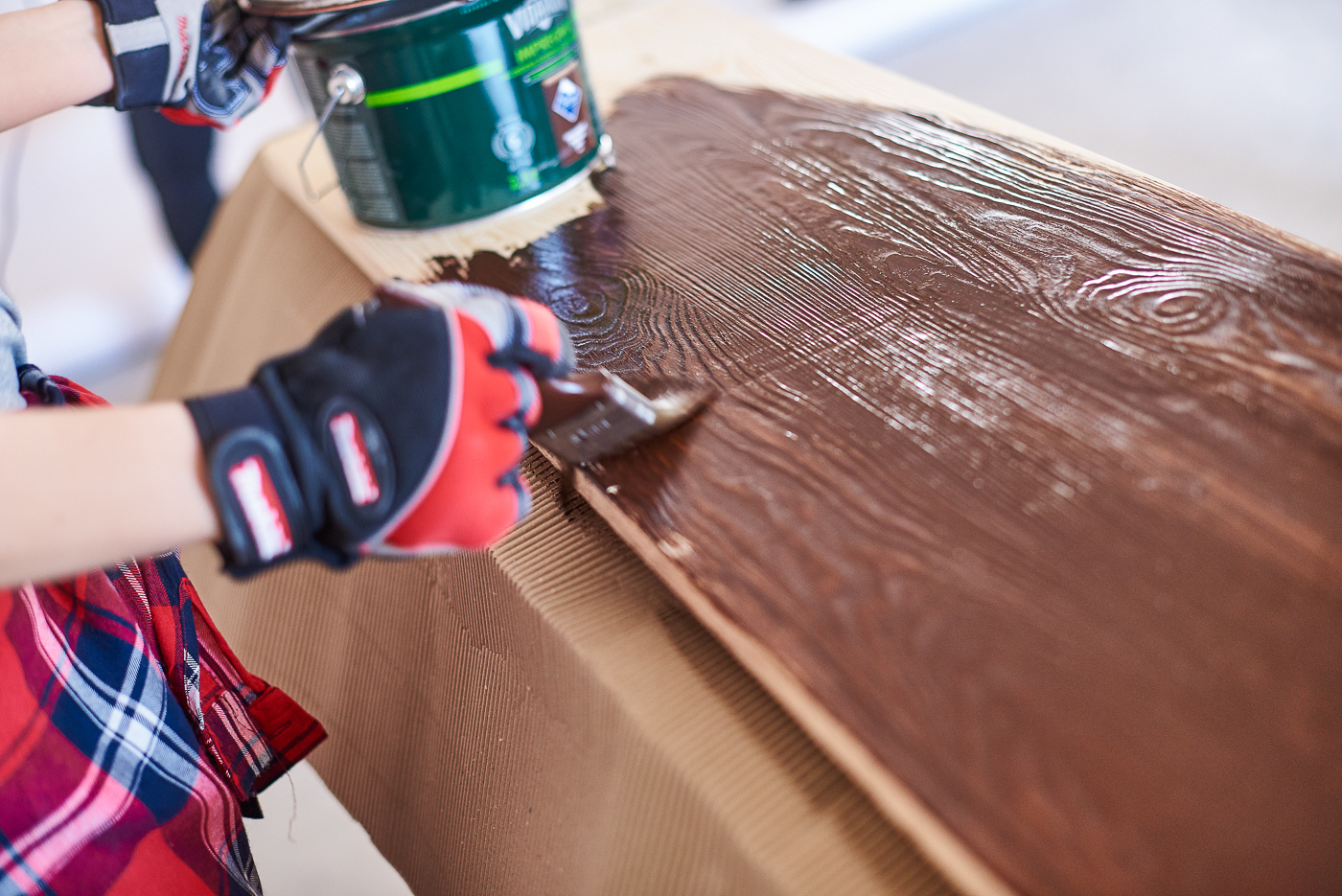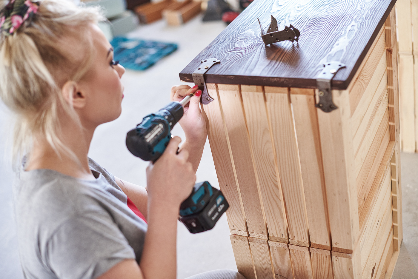 Po szlifowaniu, oczyszczamy płytę z pyłu i malujemy jedną warstwą impregnatu do drewna. Następnie łączymy ze sobą poszczególne elementy jak skrzynie i blat. W tym celu potrzebne Wam będzie kilka wkrętów i poręczna WIERTARKO-WKRĘTARKA, która poradzi sobie nawet z trudno dostępnymi zakamarkami. Blat łączymy ze skrzynkami poprzez dekoracyjne blaszki kątowe, które nie tylko dodadzą pożądany charakter meblowi ale także ukryją łby wkrętów.
