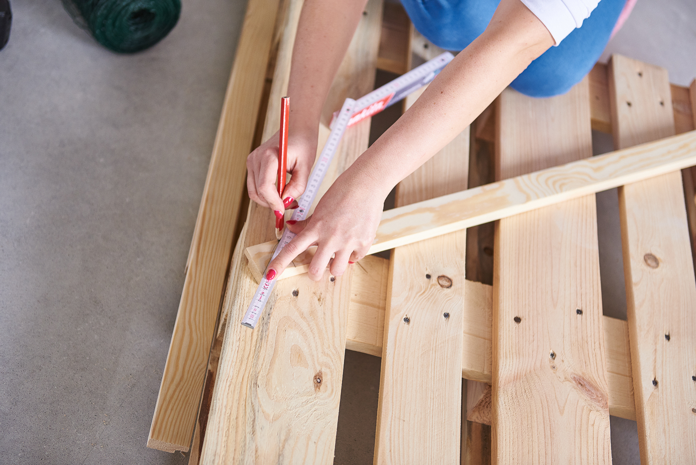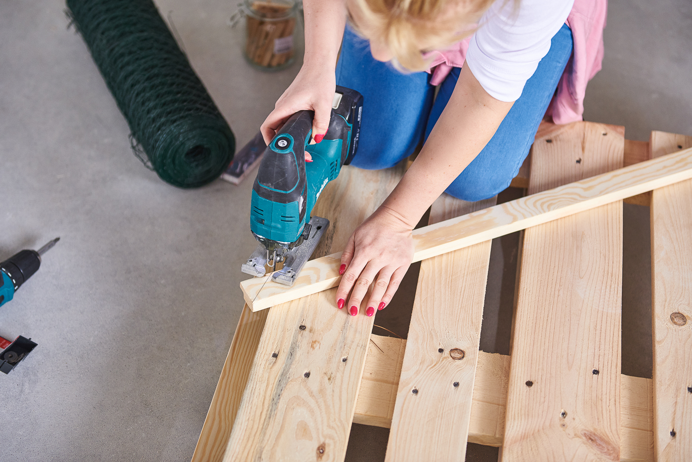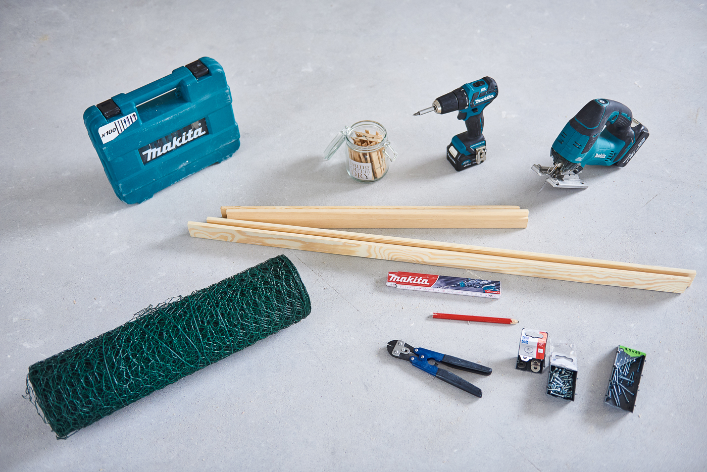 Proponuję wymierzyć i rozrysować sobie wcześniej szkielet ramki aby mieć pewność, że jej wymiary będą pasowały do naszej wizji, biurka i ogólnej aranżacji ściany. Mając pewność jakie wymiary chcemy osiągnąć, odmierzamy je analogicznie na dekoracyjnych listwach. Zaznaczamy również linię zakończenia poszczególnych listew, zwracając szczególną uwagę na narożniki. Jeśli mamy wprawę możemy zrobić to z pomocą linijki lub metrówki. Jeśli natomiast robimy to po raz pierwszy, proponuję użyć w tym celu specjalnego bloku do cięcia, który wskazuje pod jakim kątem ciąć listewki. Przechodzimy do wycinania, które z pomocą wyrzynarki Makita jest jak cięcie papieru nożyczkami. Następnie listwy łączymy ze sobą z pomocą wkrętów i wiertarko-wkrętarki. W ten sposób uzyskujemy szkielet naszego organizatora. Przechodzimy do wycięcia siatki ogrodniczej, którą to z kolei przymocujemy do ramki z pomocą krótkich wkrętów. Polecam użycie także metalowych podkładek do wkrętów, które nie wydostaną się poza otwory siatki, dodatkowo ją zabezpieczając. Pozostaje przymocowanie organizatora do ściany i udekorowanie go codziennymi notatkami.