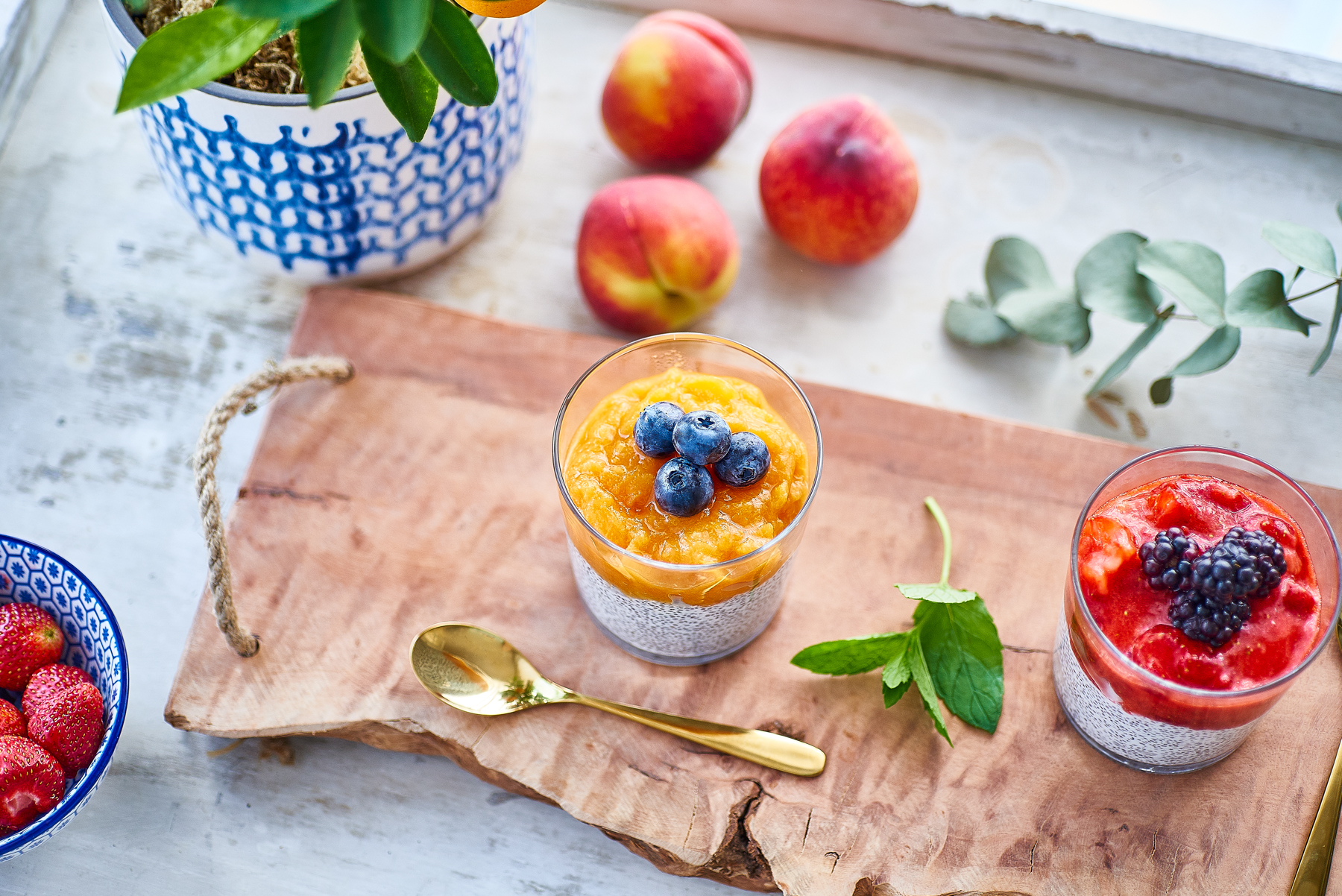 W misce wymieszałam mleko kokosowe oraz wodę, nasiona chia i syrop klonowy. Składniki mieszałam bardzo energicznie przez kilka minut. Następnie przygotowany miks włożyłam do lodówki na około 1 godzinę. W międzyczasie przygotowałam mus owocowy, blendując wybrane składniki. Nałożyłam go na pudding i ponownie włożyłam do lodówki. Całość udekorować dostępnymi owocami.