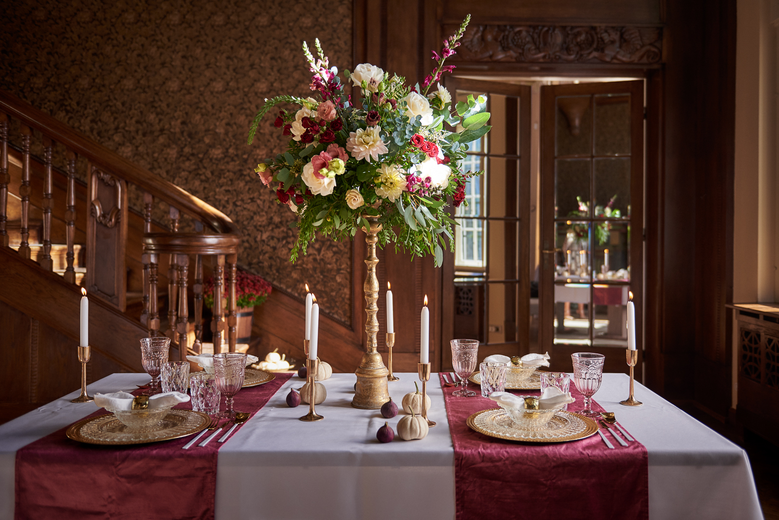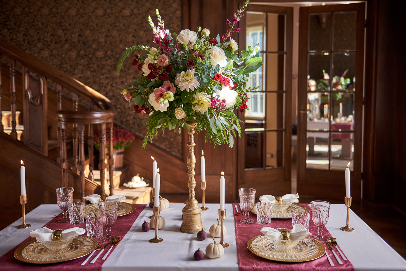 DEKORACJE: Ładne wnętrza potrzebują dekoracji, która udźwignie ciężar gatunkowy tego miejsca. Zostawiłam więc w spokoju dekorowanie elementów poza stołem, które same w sobie są wyjątkowe. Pozwoliłam sobie jednak nadrobić ekspresję dekoratorską na stole. W tej aranżacji zdecydowałam się głównie na świece i świeże kwiaty. O tym jak wykonać “krok po kroku” tę efektowną kompozycję kwiatową na wysokim stojaku, dowiecie się z kolejnego wpisu. Tymczasem zwróćcie uwagę na subtelne białe dynie-baby oraz figi, które doskonale współgrają z całą aranżacją i są świetnym podkreśleniem jesiennej aury.
