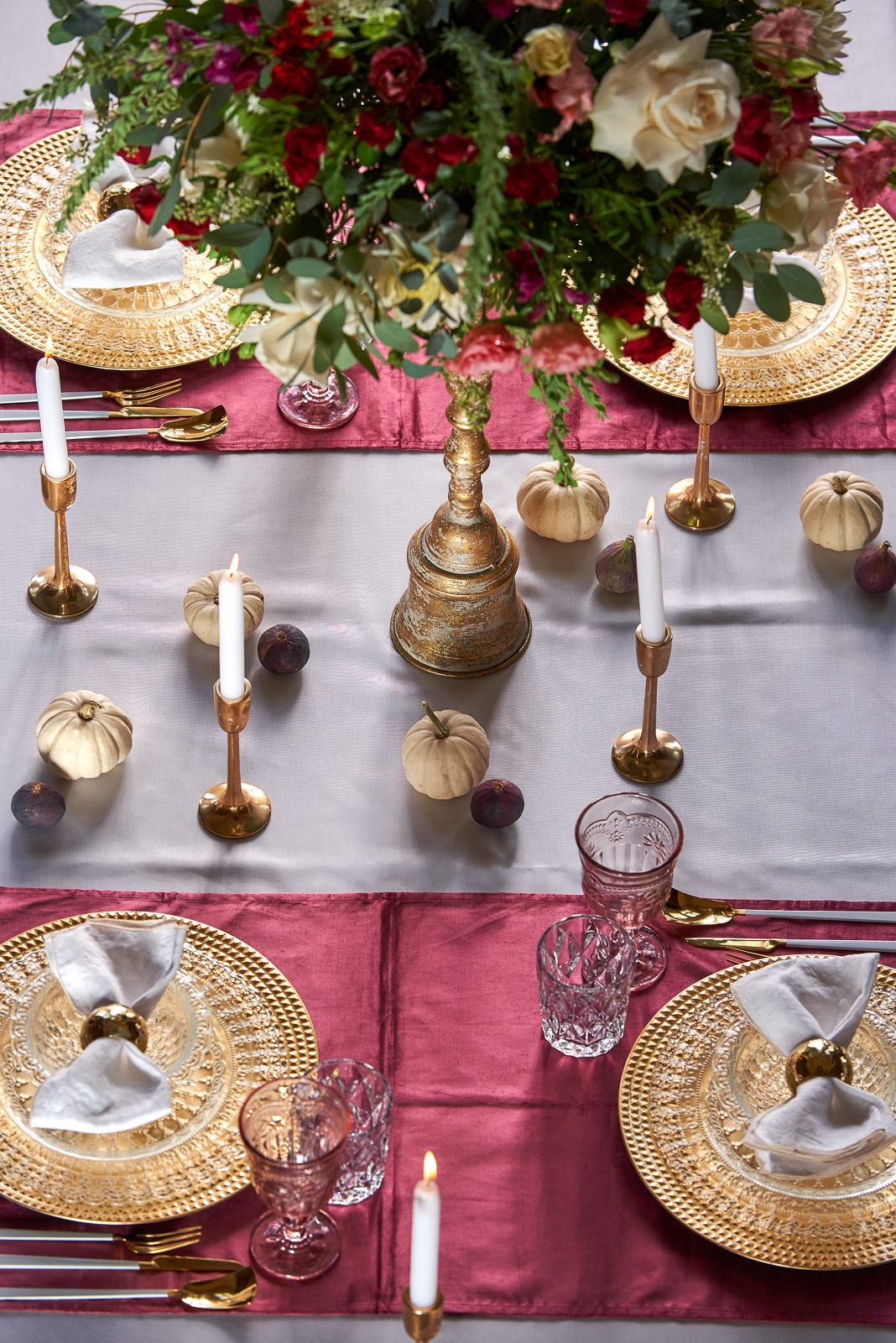 KOLORYSTYKA: Planując aranżację wnętrza, przyjęcia czy stołu zawsze zaczynamy od kolorystyki! Wybór kolorów stanowi połowę sukcesu, gdyż to na ich bazie będziemy dobierać dodatki, dekoracje i kwiaty. Tutaj obowiązuje zasada złotej trójki – decydujemy się na 3 główne kolory, których odcienie ze sobą współgrają, nie gryzą się i ładnie się wspólnie prezentują. W trakcie łączenia kolorów, zawsze szukam barwy, która nie jest najbardziej nasycona w danej kompozycji, a następnie dobieram wzór bądź kolory uzupełniające, które współgrają z całością. W tym wypadku bazujemy na odcieniach stłumionego różu (wchodzącego momentami w bordo) starego złota i bieli.