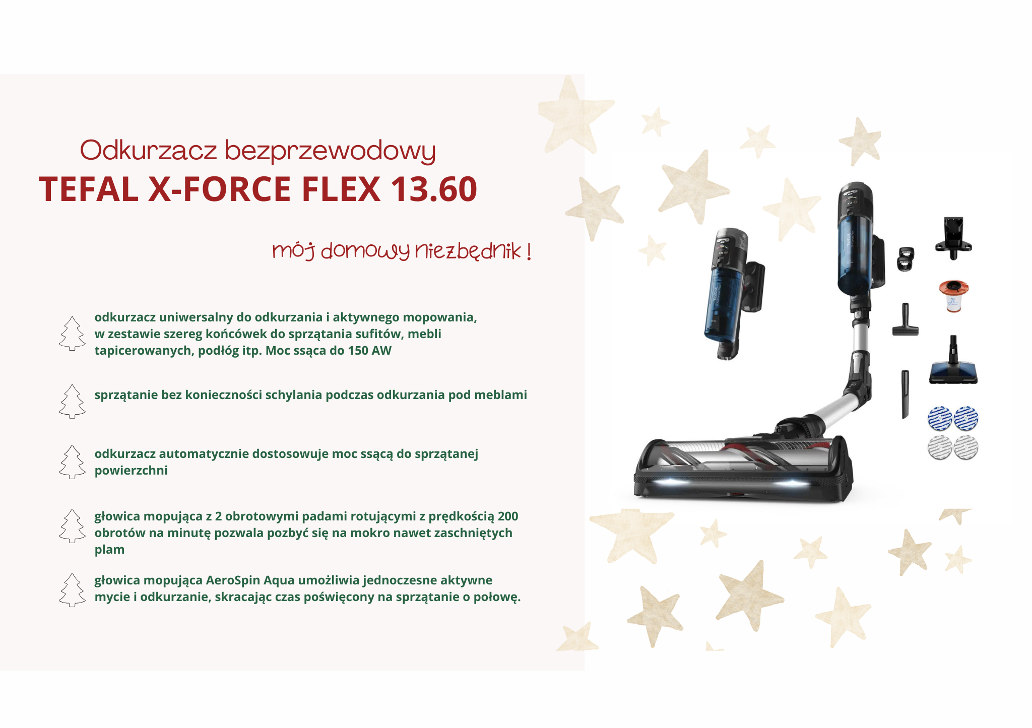 - odkurzacz X-force flex 13.60 wyposażony jest w elastyczną rurę flex, która sprawie że nie musimy się schylać odkurzając np. pod meblami, a podświetlenie LED ułatwia dokładnie odkurzanie