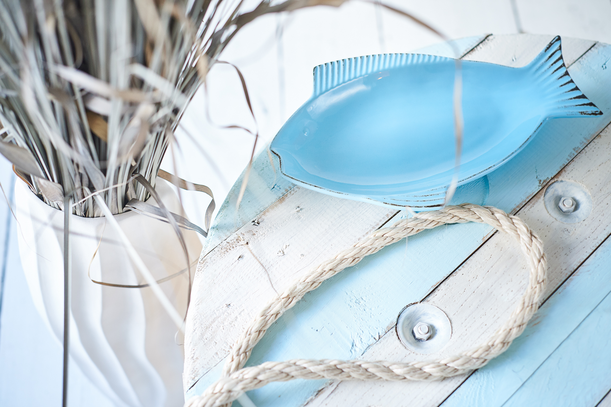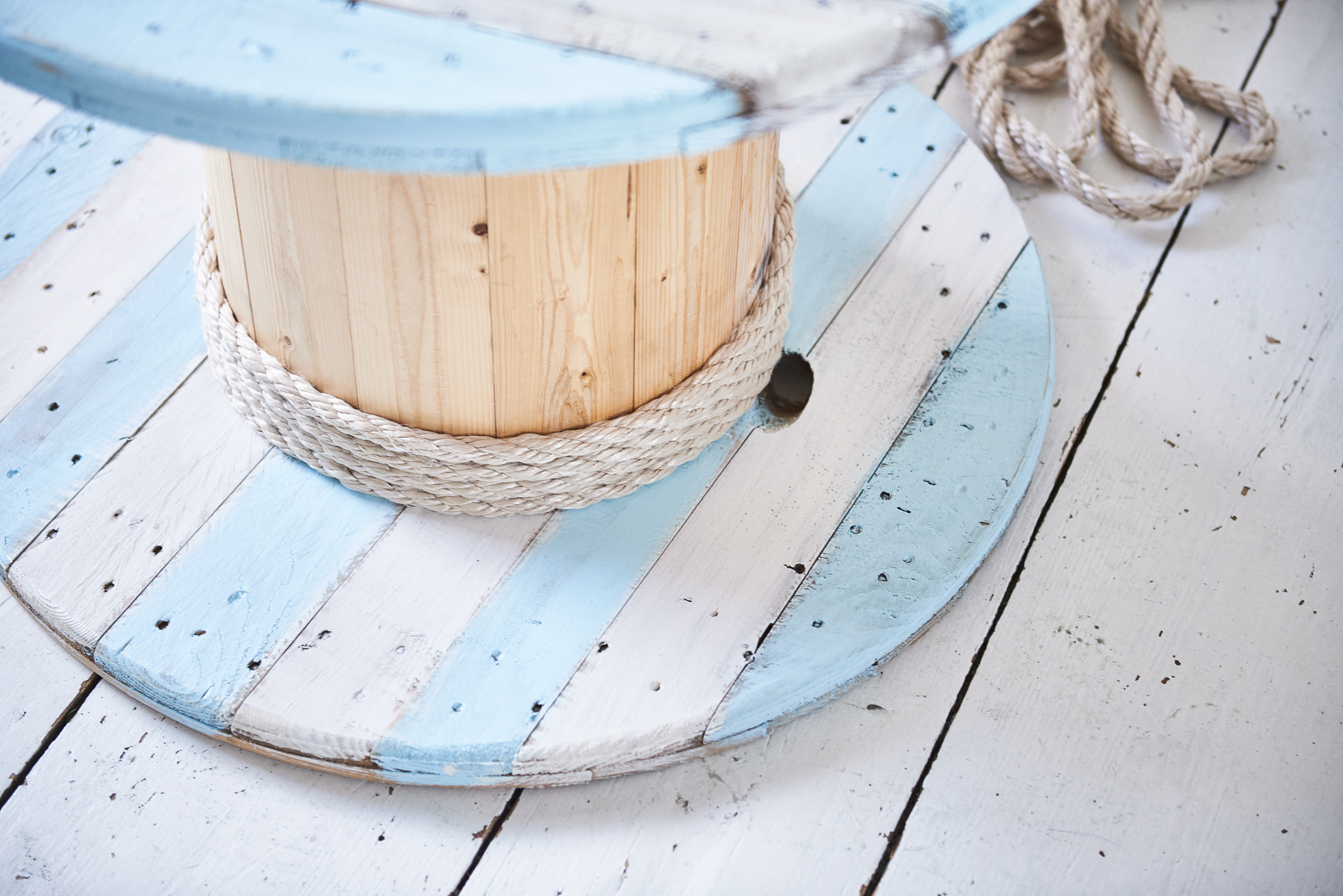 Zdecydowałam się na pomalowanie szpuli na przemian odcieniem wanilii oraz błękitu. Farby deco doskonale kryją powierzchnię, dlatego wystarczyła zaledwie jedna warstwa aby pokryć drewno kolorem. Na koniec ozdobiłam szpulę liną marynarską, która dodatkowo uwydatniła nadmorski charakter stolika.