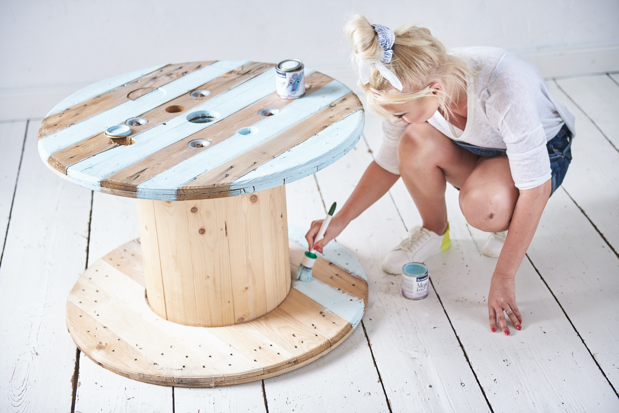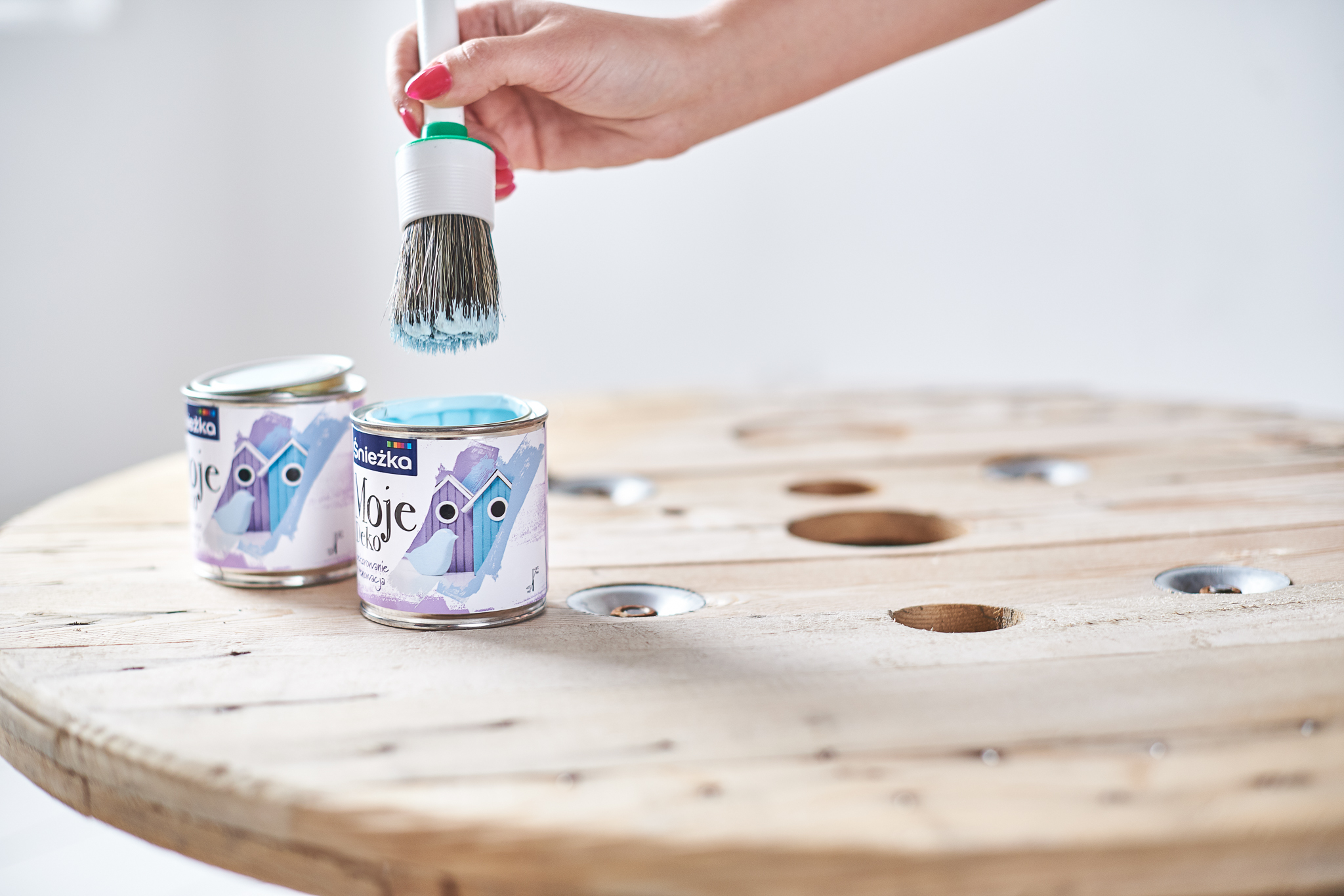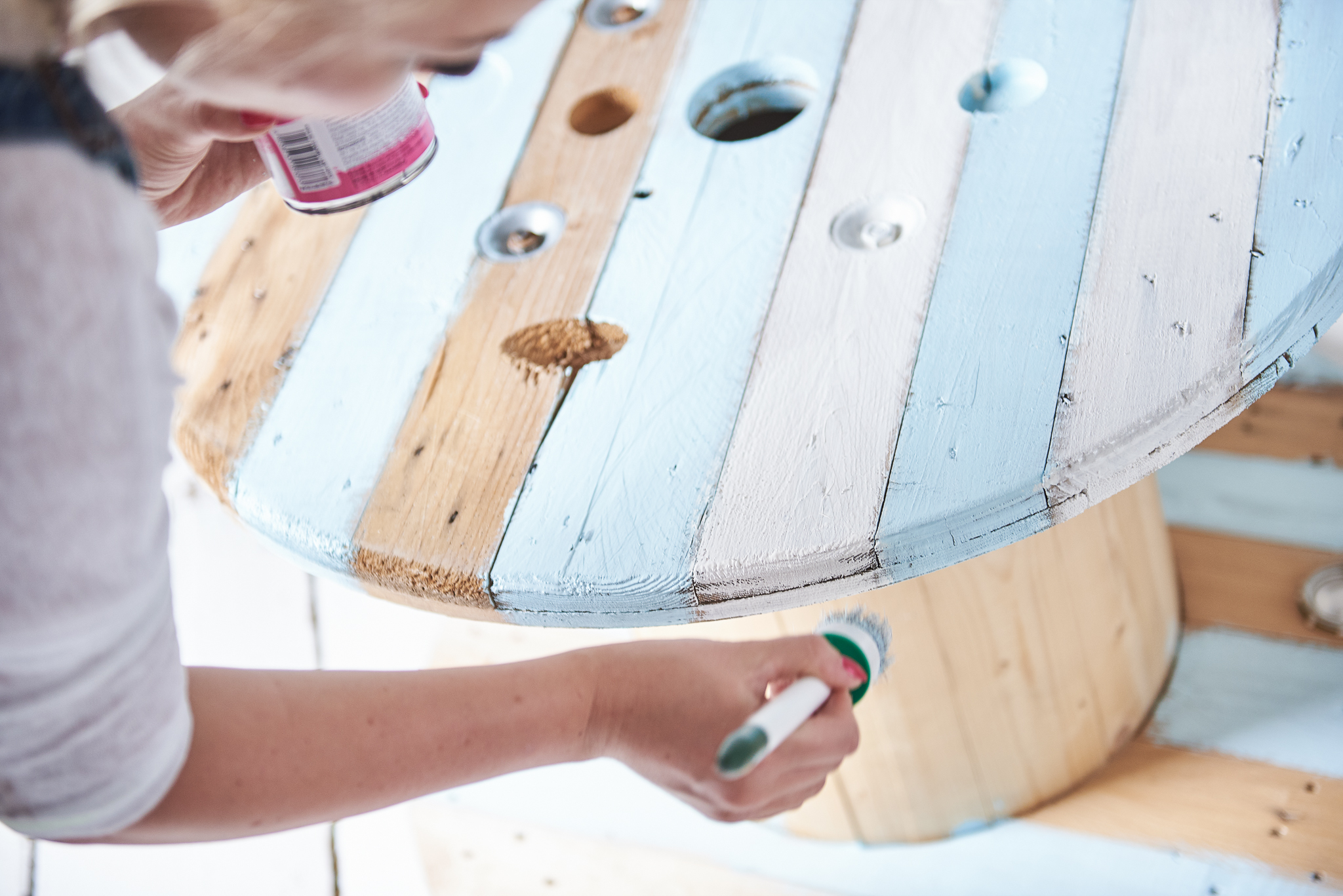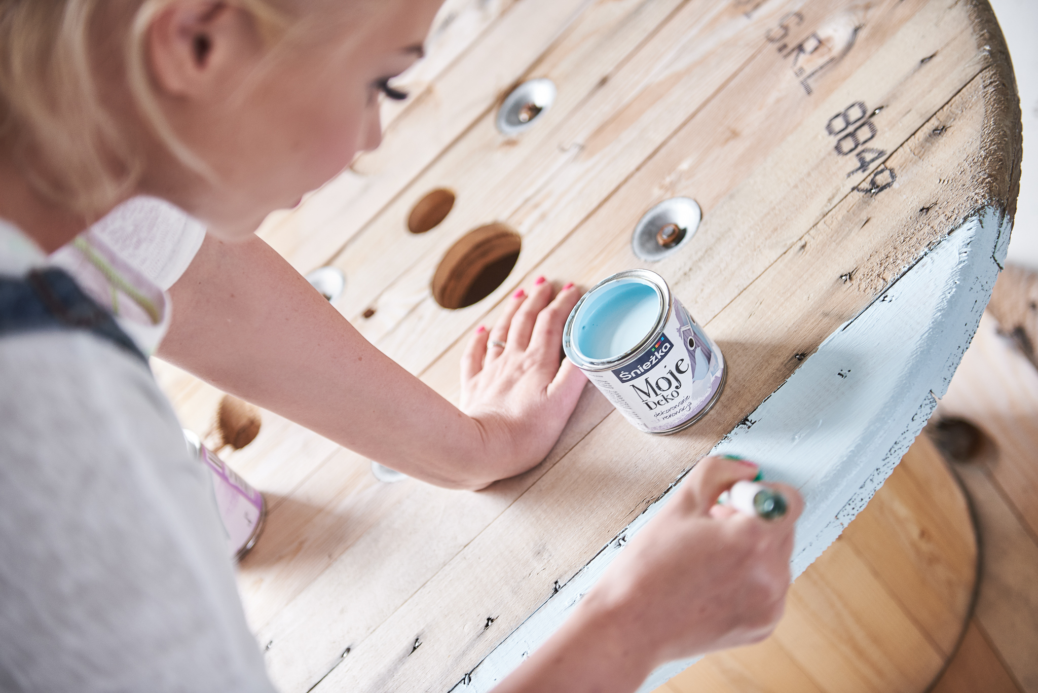 Jeżeli Wasza drewniana szpula od kabli, wymaga oczyszczenia oczyszczenia, oszlifujcie ją z pomocą szlifierki. Moja szpula była na tyle “świeża”, że mogłam pominąć tą czynność i od razu przeszłam do malowania. W przypadku stylu Hampton inspirujemy się nadmorskim klimatem dlatego malując drewno, możemy sobie pozwolić na niedociągnięcia. Efekt drewna “po przejściach” jest w tym przypadku jak najbardziej wskazany. Nasiliłam wręcz ten efekt postarzania, szlifując brzegi szpuli już po wyschnięciu farby.