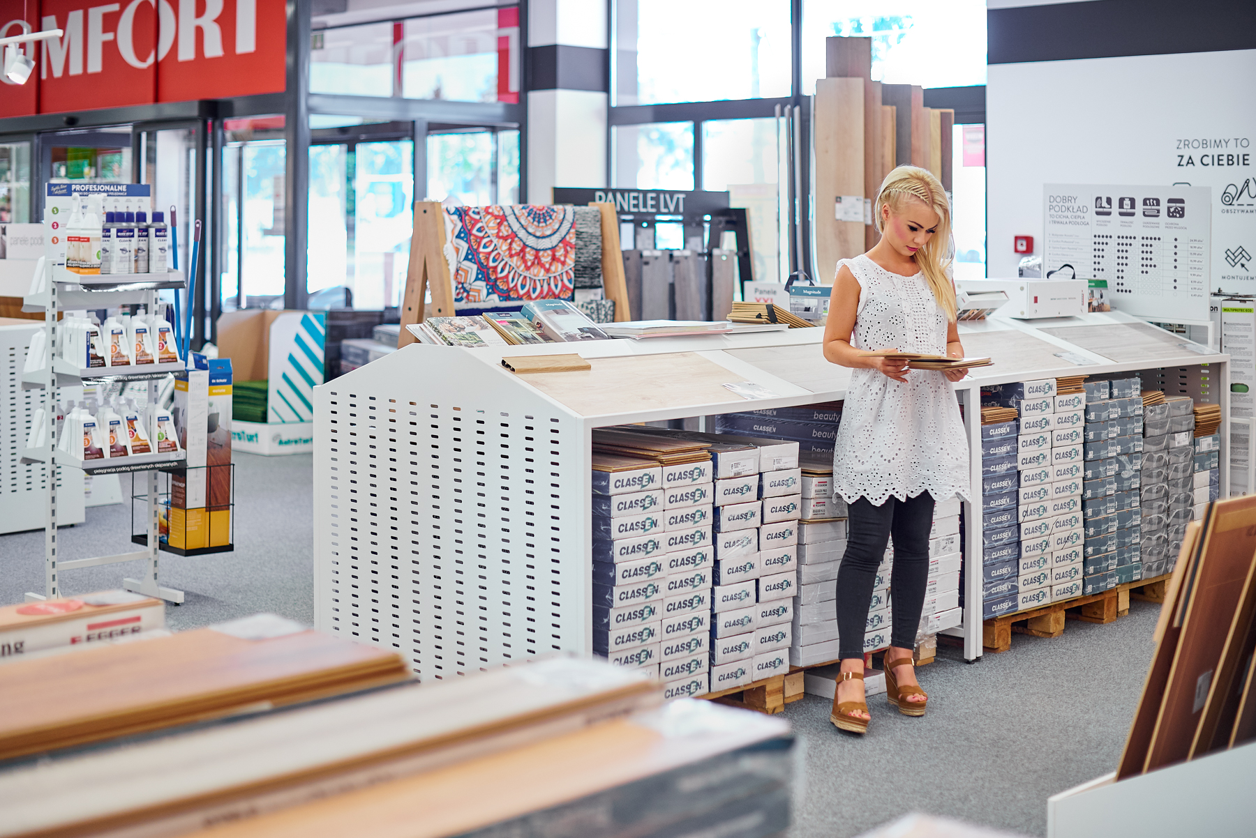 Jak widzicie na zdjęciach powyżej – odpowiednio zaaranżowane podłogi nadają każdemu z wnętrz znaczący ton i charakter. Zatem warto dokładnie przemyśleć swój wybór jeszcze przed zakupem. Jeśli oglądaliście moją metamorfozę gabinetu, to wiecie już z video, że salony KOMFORT, umożliwiają zabranie próbników do domu w celu weryfikacji czy dany kolor wygląda tak samo w naszym wnętrzu jak prezentuje się w salonie.