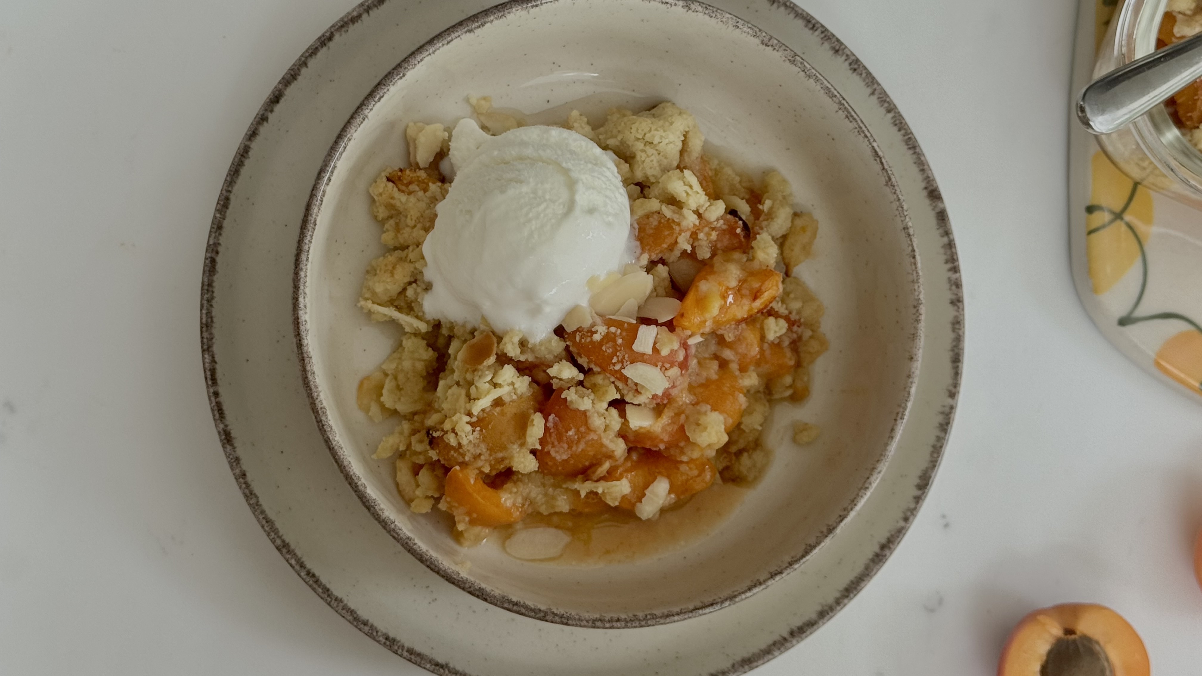 4) Ułóż morele w naczyniu żaroodpornym do airfryera. Posyp je przygotowaną kruszonką. Włóż naczynie do airfryera i piecz w temperaturze 170-180°C przez 10 minut, aż kruszonka będzie złocista i chrupiąca.