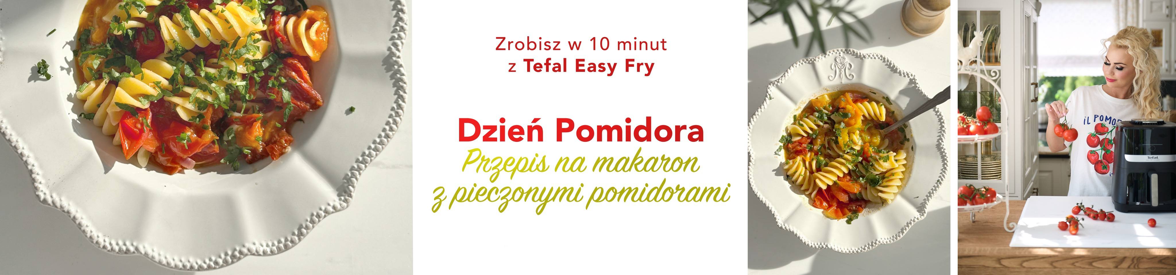 Przepis na makaron z pieczonymi pomidorami został przygotowany w Tefal Easy Fry Silence tzw. frytkownicy beztłuszczowej. Gotowanie w frytkownicy beztłuszczowej, zwanej także airfryerem, polega na pieczeniu potraw przy użyciu gorącego powietrza. Frytkownica beztłuszczowa jest zdrowa, bo wymaga dużo mniej tłuszczu niż tradycyjna frytkownica.