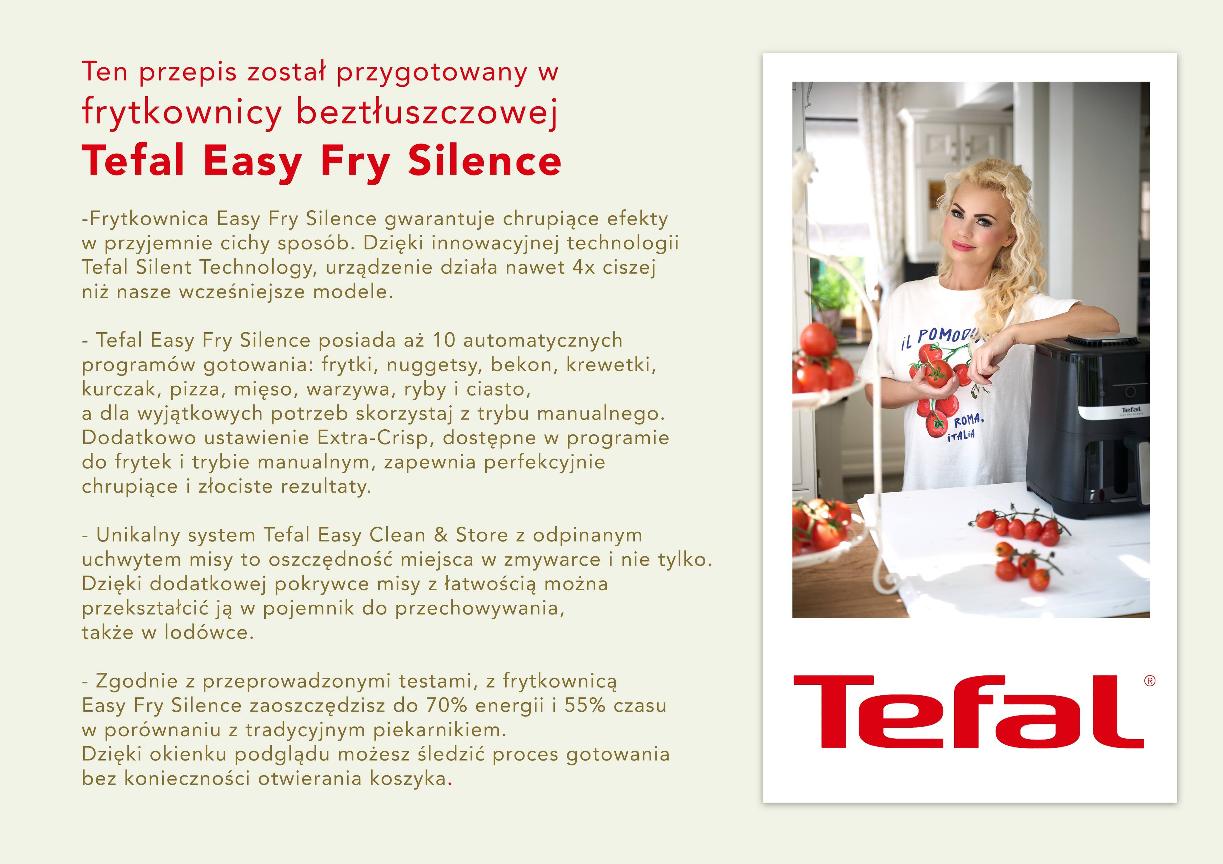Ten przepis przygotowałam w Tefal Easy Fry Silence tzw. frytkownicy beztłuszczowej. Gotowanie w frytkownicy beztłuszczowej, zwanej także airfryerem, polega na pieczeniu potraw przy użyciu gorącego powietrza. Frytkownica beztłuszczowa jest zdrowa, bo wymaga dużo mniej tłuszczu niż tradycyjna frytkownica. A do tego mięsa, ciasta i warzywa wychodzą z tego sprzętu zawsze idealnie wypieczone!