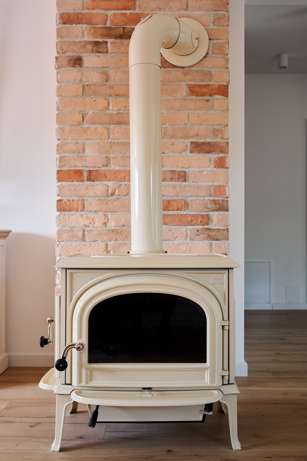 - Komin został dodatkowo wyłożony (na całej wysokości domu: trzech piętrach) cegłą, która wprowadziła motyw łączący wystrój trzech wnętrz, a także bardzo ociepliła klimat całego pokoju.