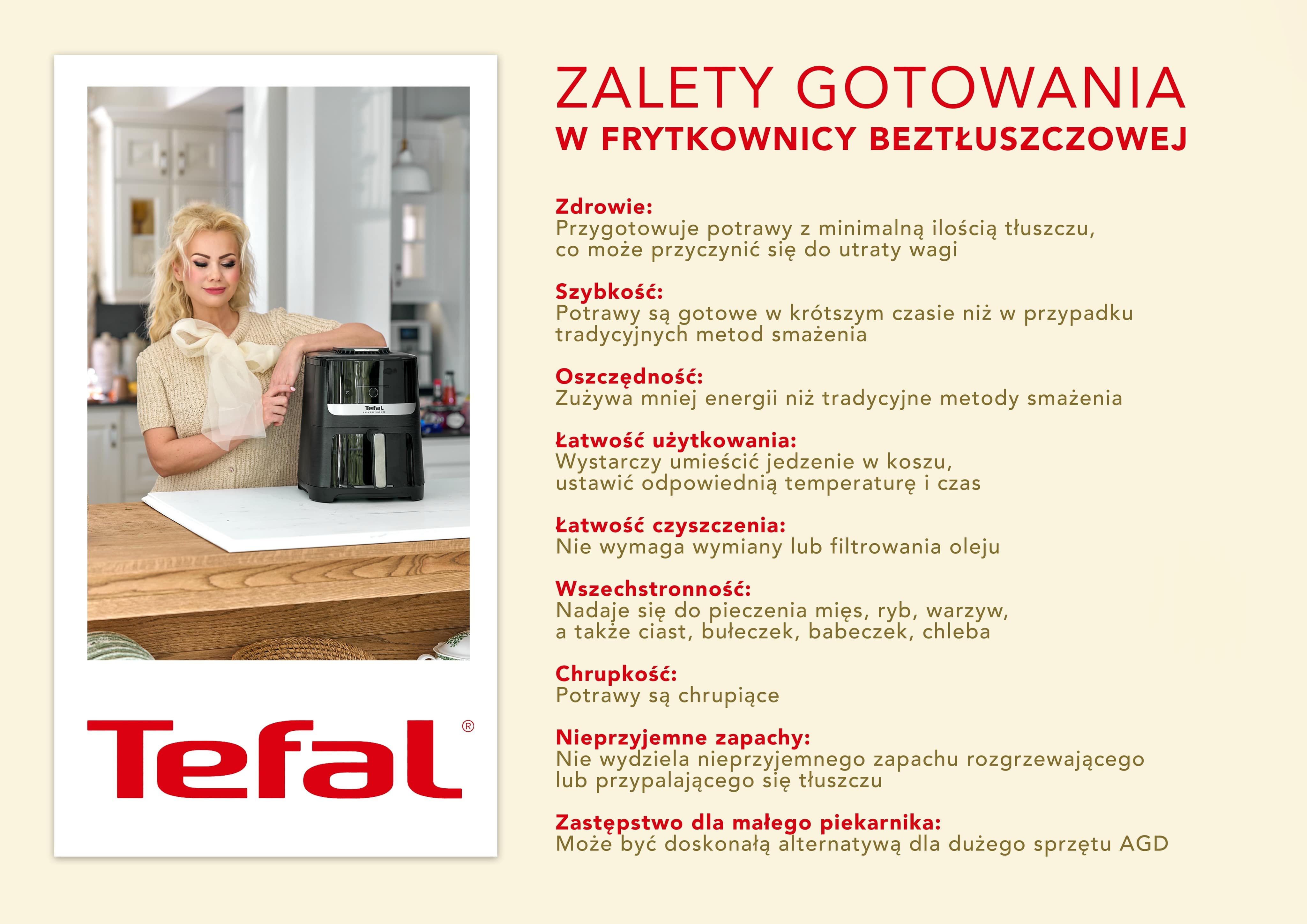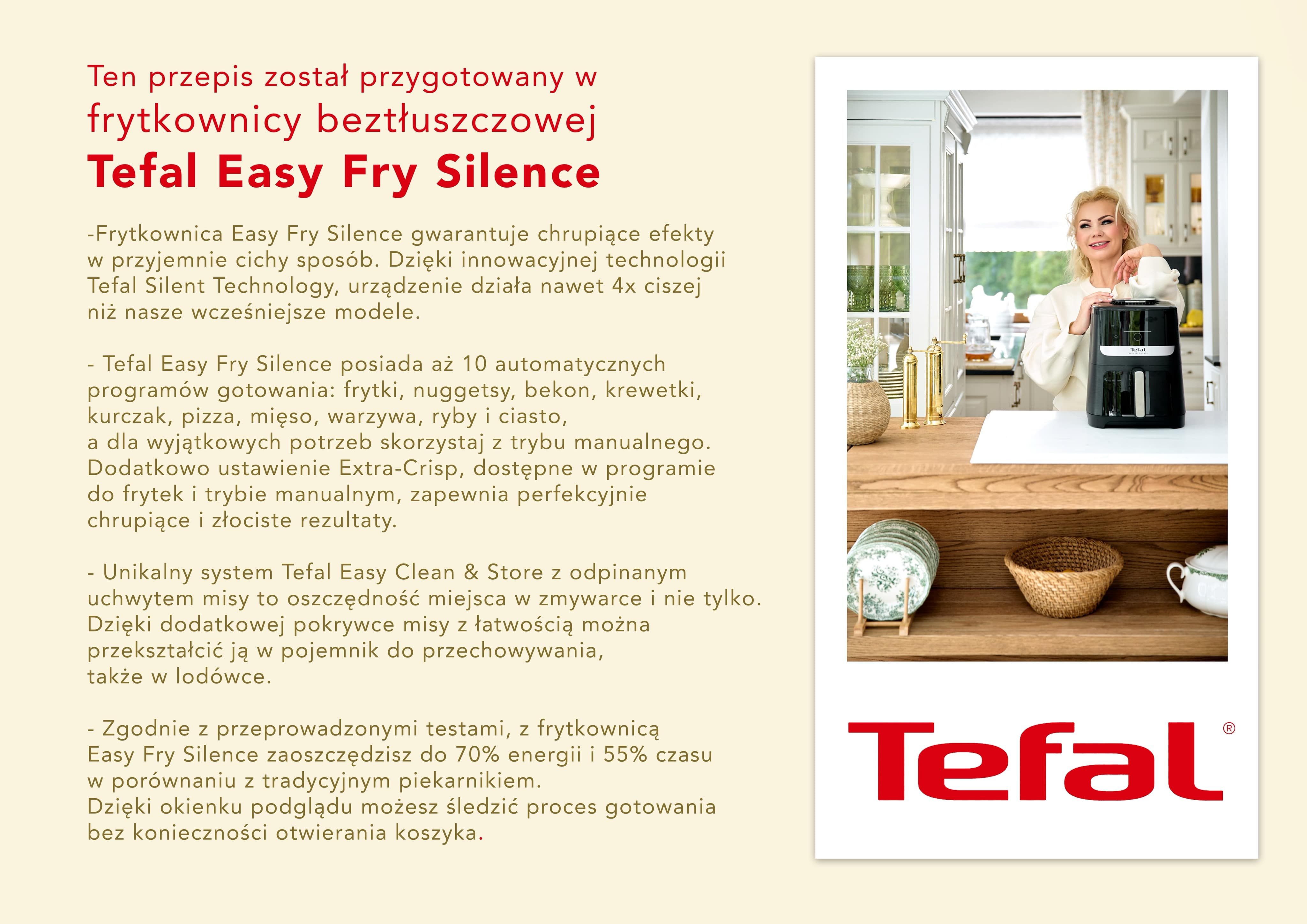 Ten przepis przygotowałam w Tefal Easy Fry Silence tzw. frytkownicy beztłuszczowej. Gotowanie w frytkownicy beztłuszczowej, zwanej także airfryerem, polega na pieczeniu potraw przy użyciu gorącego powietrza. Frytkownica beztłuszczowa jest zdrowa, bo wymaga dużo mniej tłuszczu niż tradycyjna frytkownica. A do tego wypieki, mięsa, warzywa i ciasta wychodzą z tego sprzętu zawsze idealnie wypieczone!