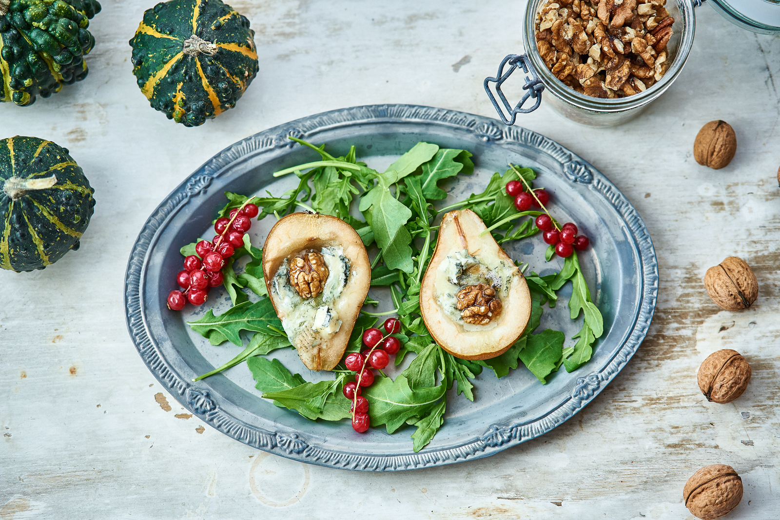 2. Owoce faszerujemy serem pleśniowym, dodajemy orzechy włoskie i polewamy miodem.