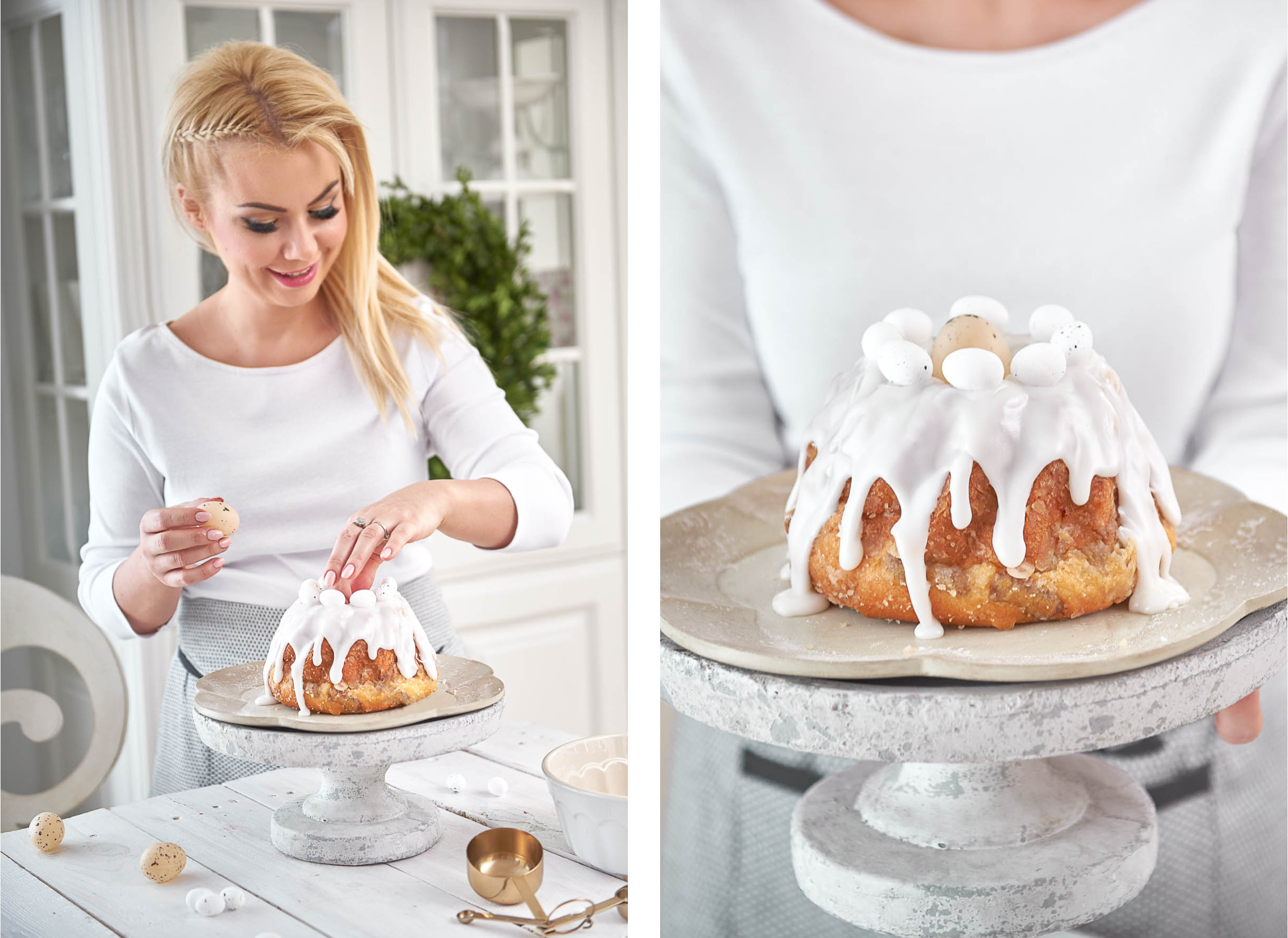 - Po ostudzeniu wyjmujemy babkę na przeznaczone naczynie i dekorujemy lukrem oraz jajeczkami.