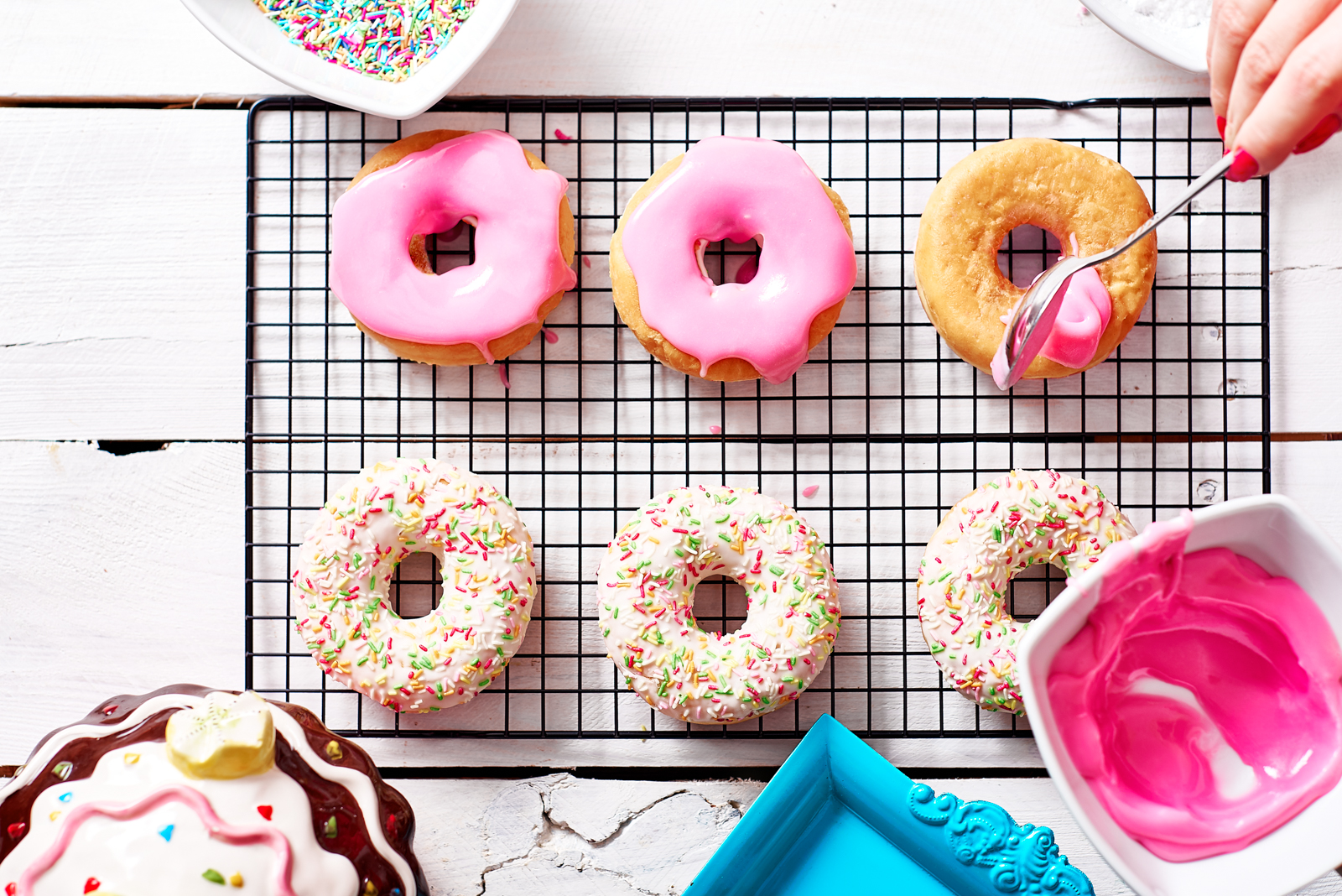 Przygotowanie donatów według poniższej receptury zajmie Wam około 3 godziny, za to gwarantuję, że pokochacie ten przepis! A ponadto będziecie mogli na bazie niego zrobić również tradycyjne pączki z nadzieniem. Amerykańskie donaty to nie tylko genialny smak i prawdziwa rozkosz dla wielbicieli słodyczy ale także nieograniczona możliwość tworzenia! Przed przystąpienie do wyrabiania, zastanówcie się jakie wariacje kolorystyczne chcecie uzyskać. A także przygotujcie kilka różnych posypek. Sprawdzą się tutaj kruszone pistacje, migdały, wiórki kokosowe czy kandyzowane skórki owoców.