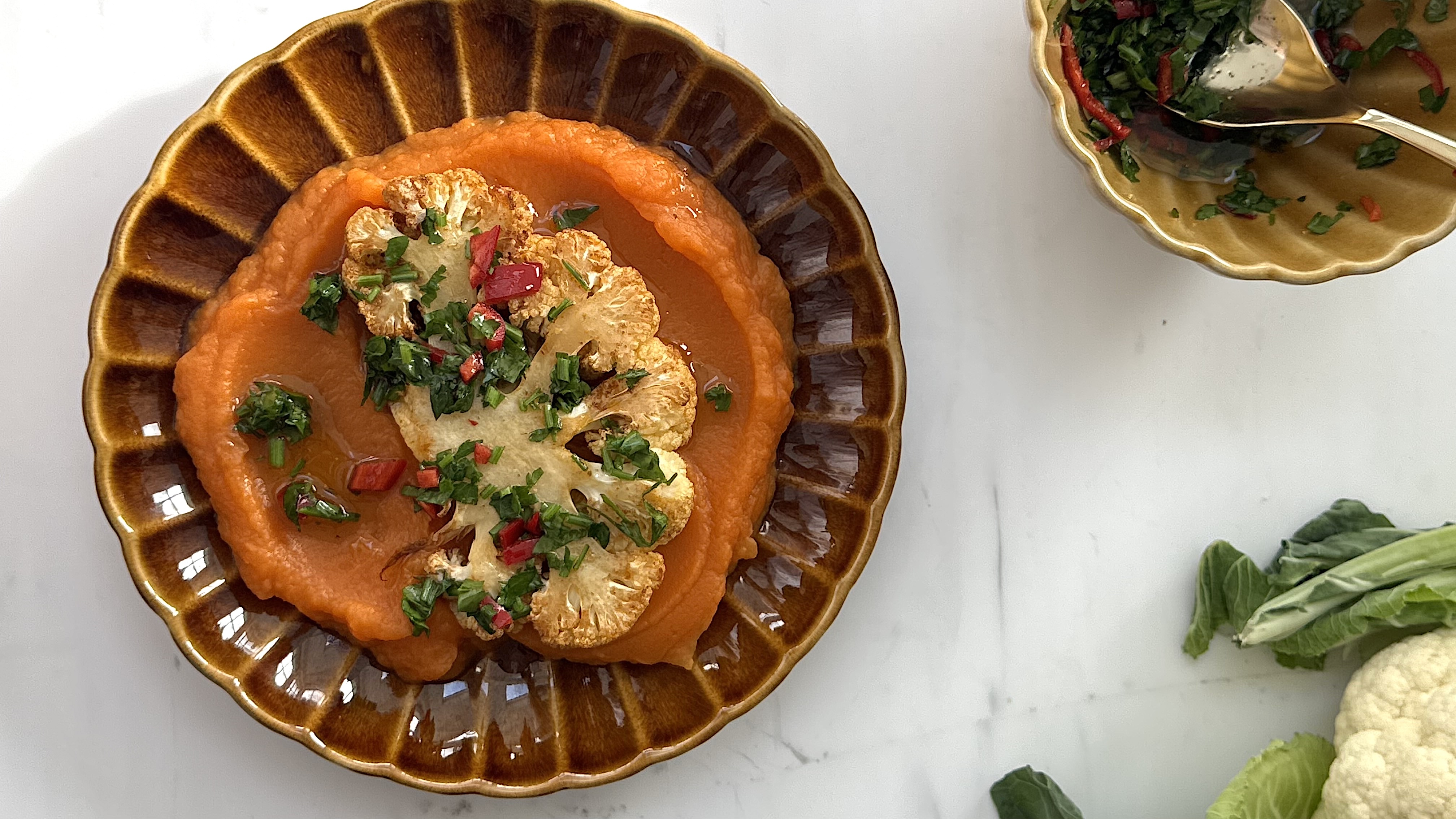 - W tym czasie zblenduj ugotowanego batata na puree z sokiem z cytryny i czerwoną papryką. Puree rozsmaruj na talerzu