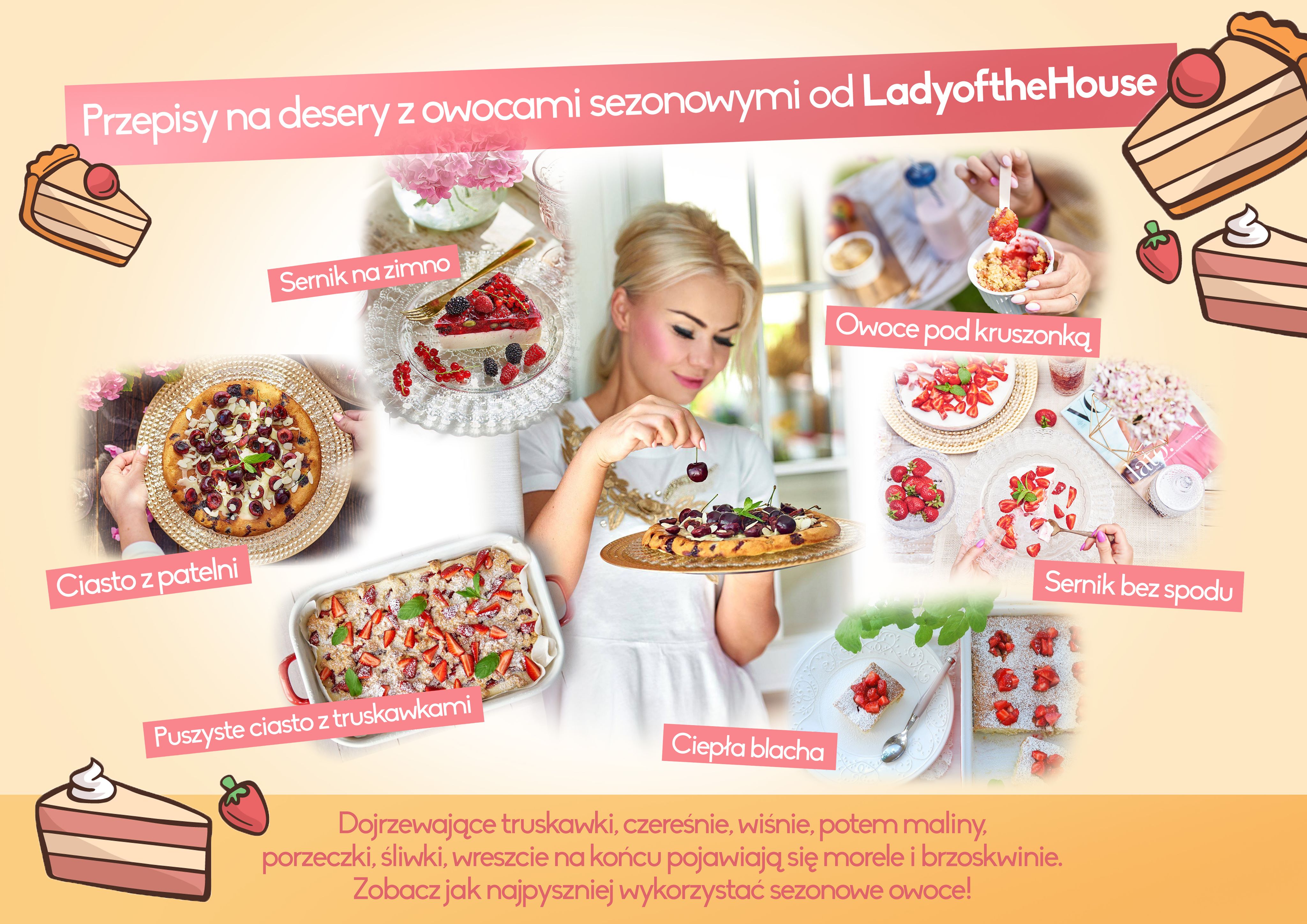 W naszym klimacie, nie wolno przegapić ani jednego gorącego dnia! Przez dwie trzecie mamy właściwie jedną porę roku: ponuro-burą. Stale marzymy o słońcu, więc kiedy wreszcie jest z nami – bierzmy z niego tyle blasku i radości, ile tylko jesteśmy w stanie pomieścić. W końcu kadego ciepłego dnia można celebrować lato np. zjeść posiłek na balkonie, w ogródku, lub gdziekolwiek byleby z widokiem na świat. W dzisiejszym materiale zebrałam dla Was moje ulubione przepisy na desery letnie…