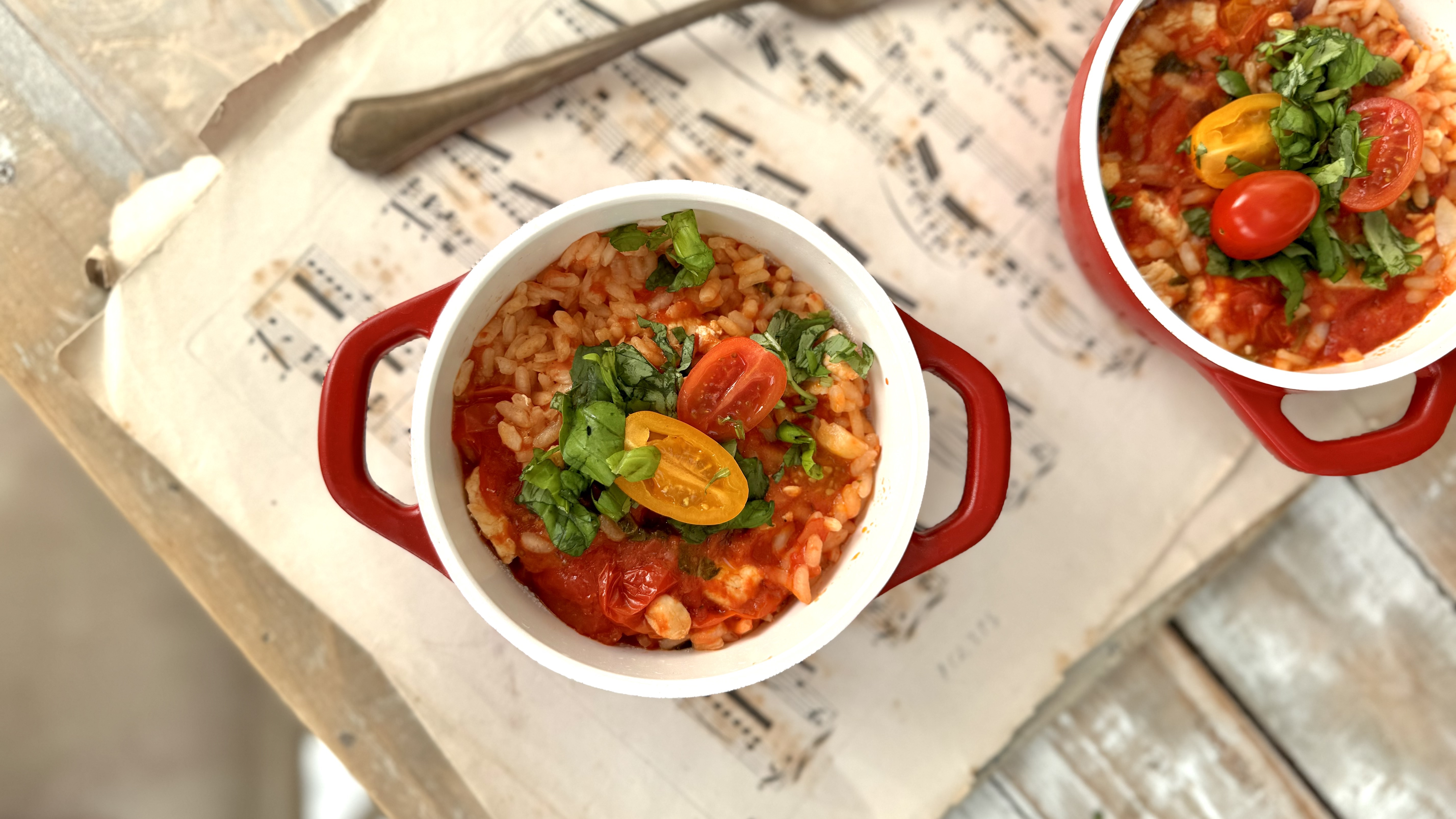 - Dodajemy pomidory z puszki, następnie bulion, ryż i pomidorki koktajlowe. Na wierzch posiekaną drobno świeżą bazylię