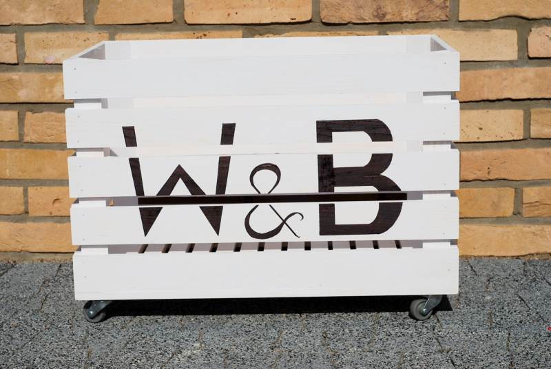 Skrzynię wycieramy papierem ściernym. Malujemy na wybrany kolor. W razie potrzeby ponawiamy malowanie, po wyschnięciu. Mocujemy kółka. Personalizujemy skrzynię wg. własnych potrzeb. My ze względu na właścicieli zdecydowaliśmy się na połączenie pierwszych liter imion: Wiktor&Borys;)