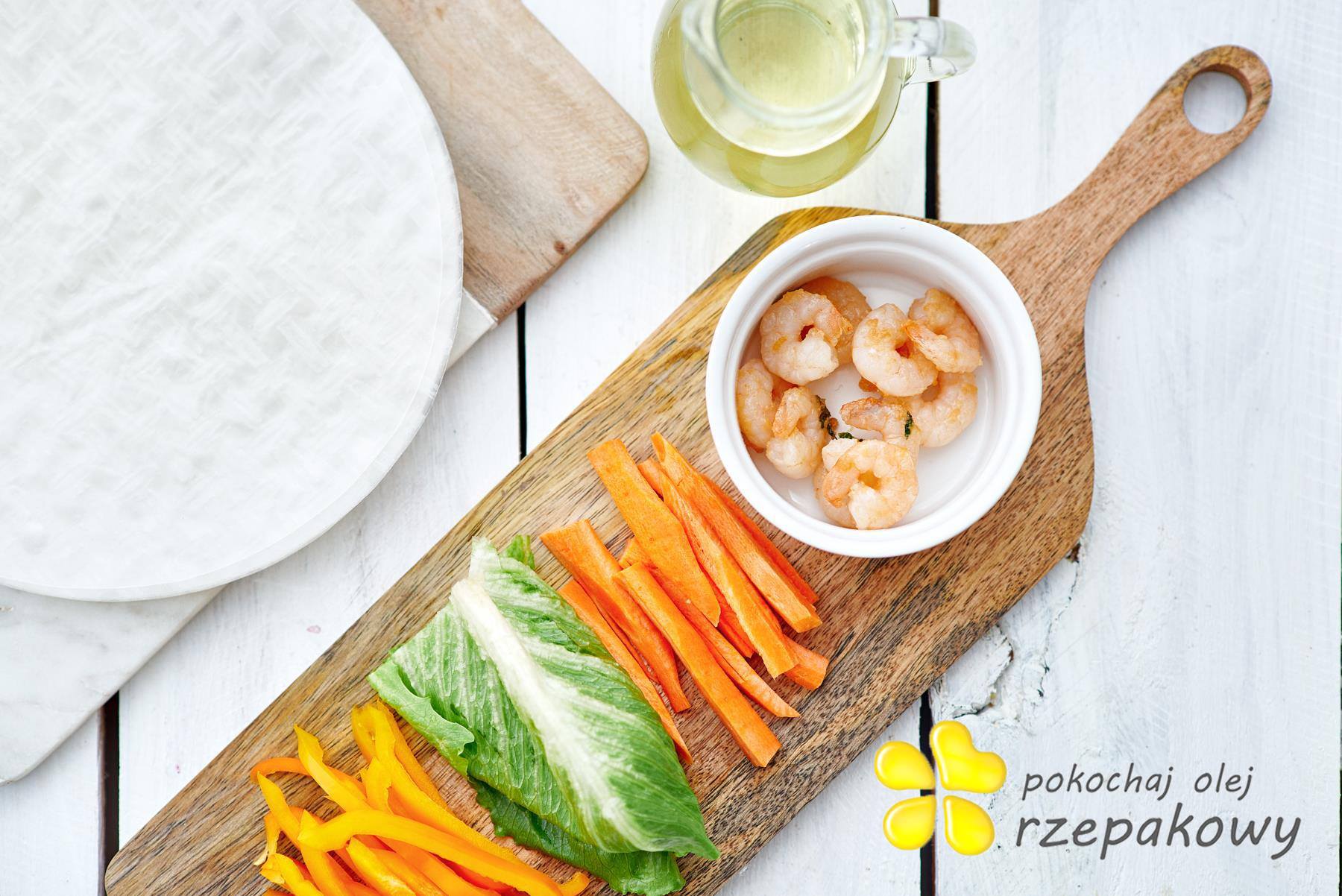 Krewetki rozmrażamy a następnie myjemy pod bieżącą wodą. Osuszamy w ręczniku papierowym. Na patelnię wlewamy olej rzepakowy (tak aby przykryło wierzch). Nagrzewamy patelnię a następnie przekładamy na nią krewetki z odrobiną posiekanej świeżej pietruszki i szczyptą soli himalajskiej. Smażymy tak krewetki w wysokiej temperaturze aż do zarumienienia. Oczyszczoną marchewkę i paprykę kroimy w cienkie słupki o długości 6 cm. Za pomocą kuchennego pędzelka zwilżamy wodą papier ryżowy, aż stanie się miękki i elastyczny. Na środku każdego arkuszu układamy po kilka paseczków papryki i marchewki, po 1 liściu sałaty rzymskiej i 3 krewetki. Zawijamy do środka dwa boki arkusza i rolujemy.