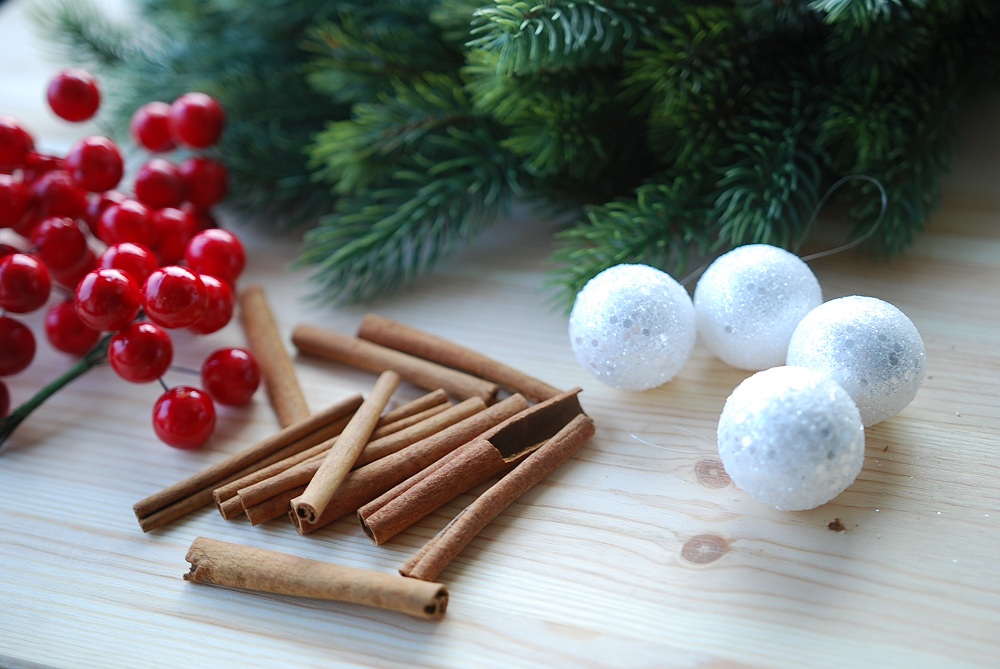4. ozdoby (użyłam tego samego motywu w całym domu: białe bombeczki, laski cynamonu, czerwone dodatki)