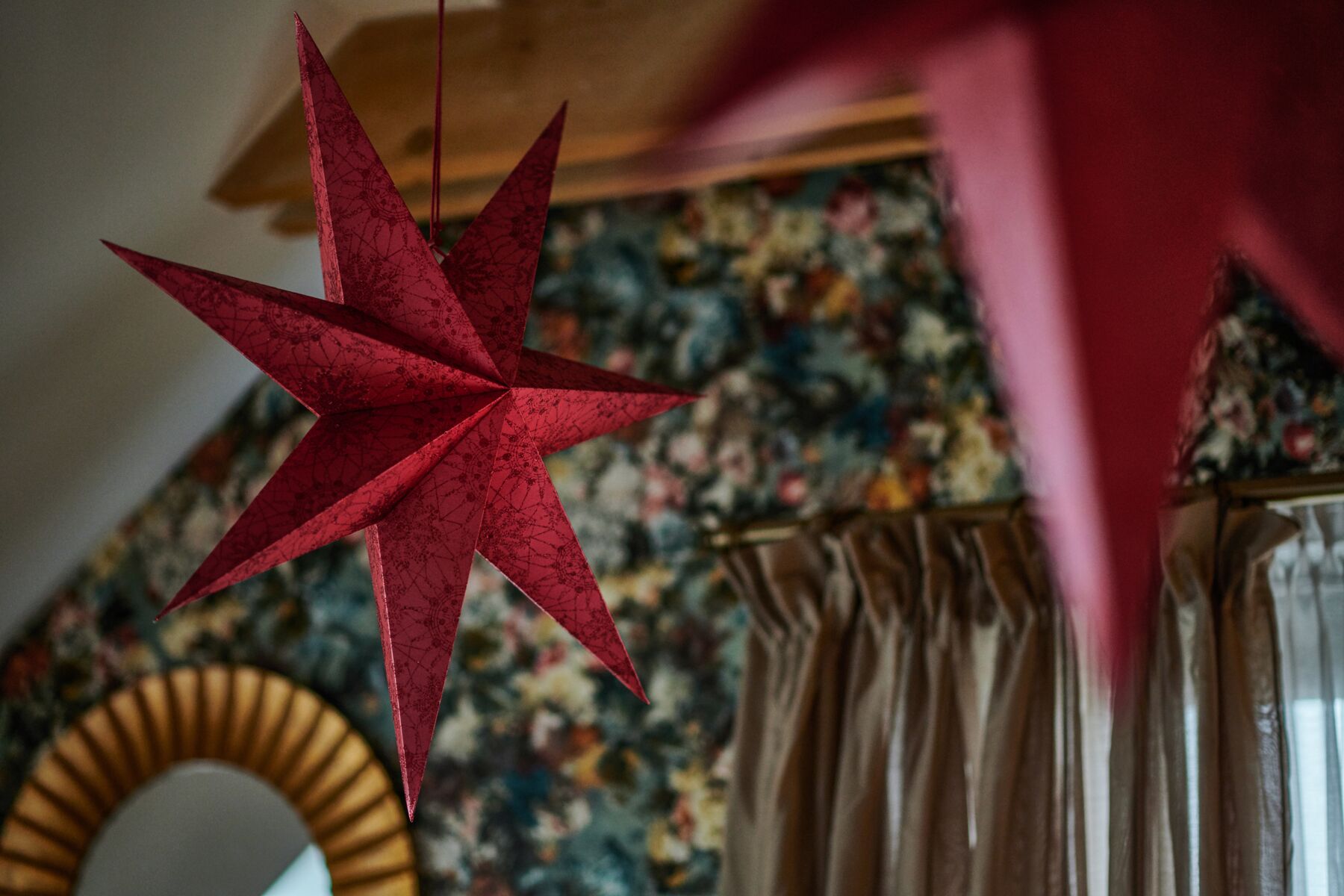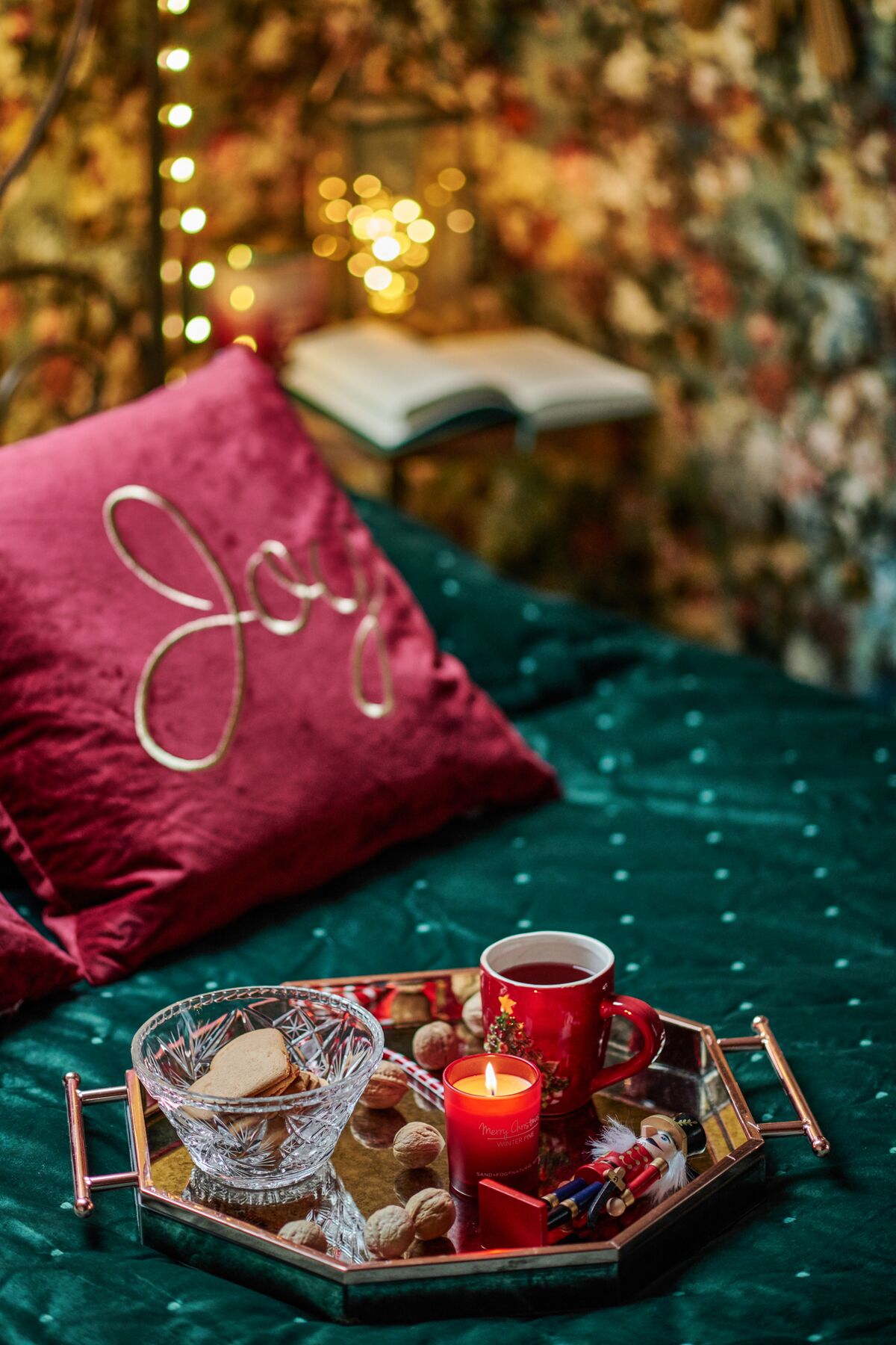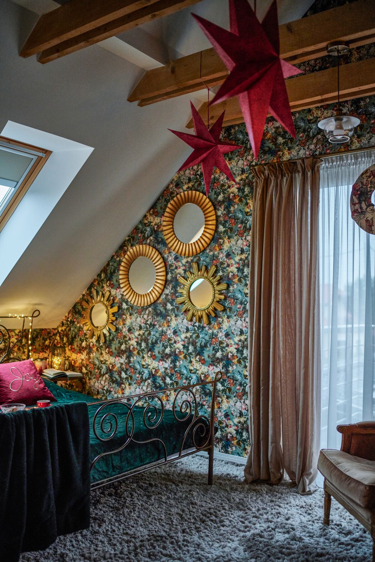 Kiedy pół roku temu przeprowadziłam metamorfozę sypialni, byłam zachwycona efektem końcowym. Odważna tapeta – zdeterminowała wnętrze, przynosząc jednocześnie klimat, który chciałam. Kiedy jednak opadły pierwsze emocje, zaczęłam obawiać się tylko jednego: Co z wystrojem świątecznym w pomieszczeniu, tak bardzo określonym w końcu ale jednak przez…kwiaty? Ta myśl nie opuszczała mnie do samego okresu przedświątecznego. Okazało się, że wcale niepotrzebnie! Dzisiejszy materiał, który dla Was przygotowałam – ma nadzieję stanie się rozwiązaniem dla osób posiadających trudne i bardzo określone wnętrza. Okazuje się, że w nich również możemy zaaranżować świąteczny klimat. W jaki sposób? Przede wszystkim bazując na posiadanej kolorystyce. I tak z mojej sypialni wyłuskałam 3 bazowe kolory: bordo, złoto oraz butelkową zieleń. Tym samym na trzech wymienionych kolorach przygotowałam świąteczne dekoracje zmieniając narzutę na łóżko i poduszki. Pozostałe dodatki jak: bordowe gwiazdy na belkach sufitowych, zielony koc przewieszony przez ramę łóżka, choinkę czy świeczki zapachowe – podbiły świąteczny klimat całego wnętrza.