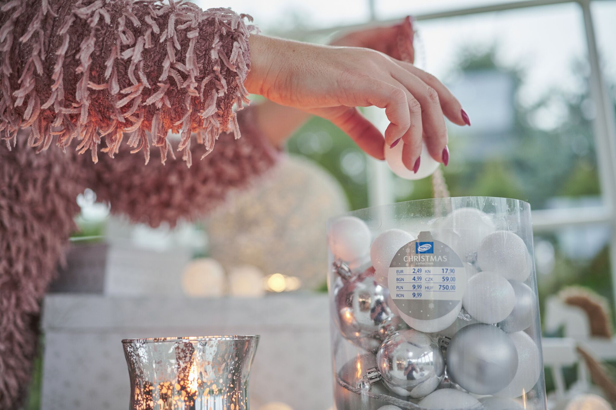 1.Lampa Cotton Ball 29.99 zł 2.Latarnia metalowa mała 19.99 zł 3.Latarnia metalowa średnia 29.99 zł 4.Latarnia metalowa duża 49.99 zł 5.Konik na biegunach 7.99 zł 6.Poduszka 19.99 zł 6.Koc 29.99 zł 7.Pudełko 9.99 zł 8.Bombki – zestaw 46 szt., różne kolory i rodzaje w opakowaniu 9,99 zł