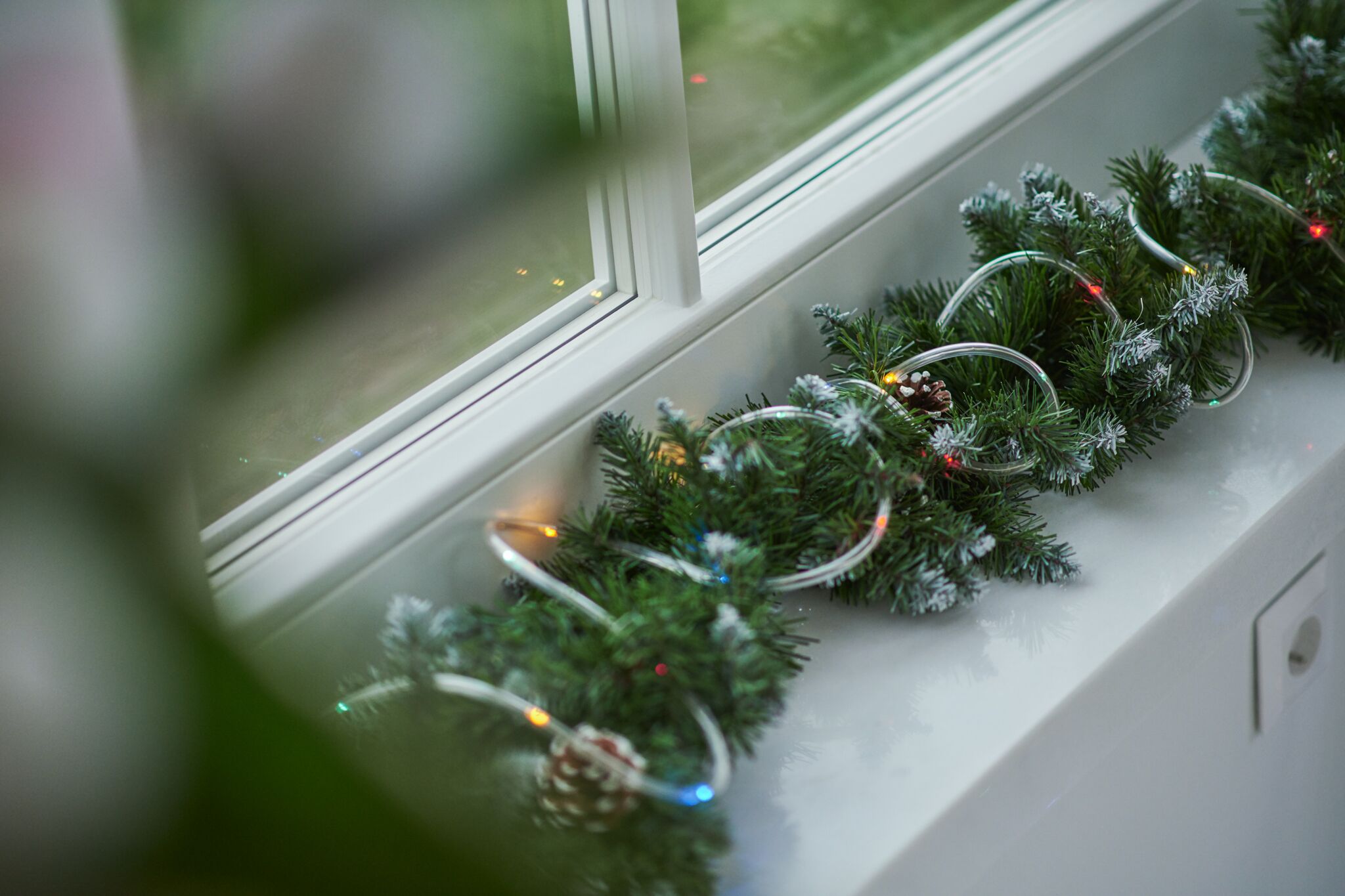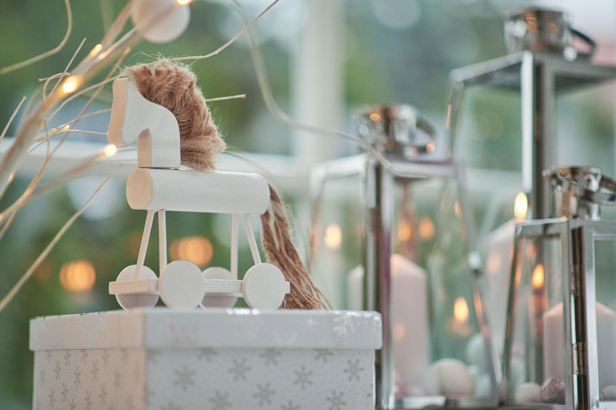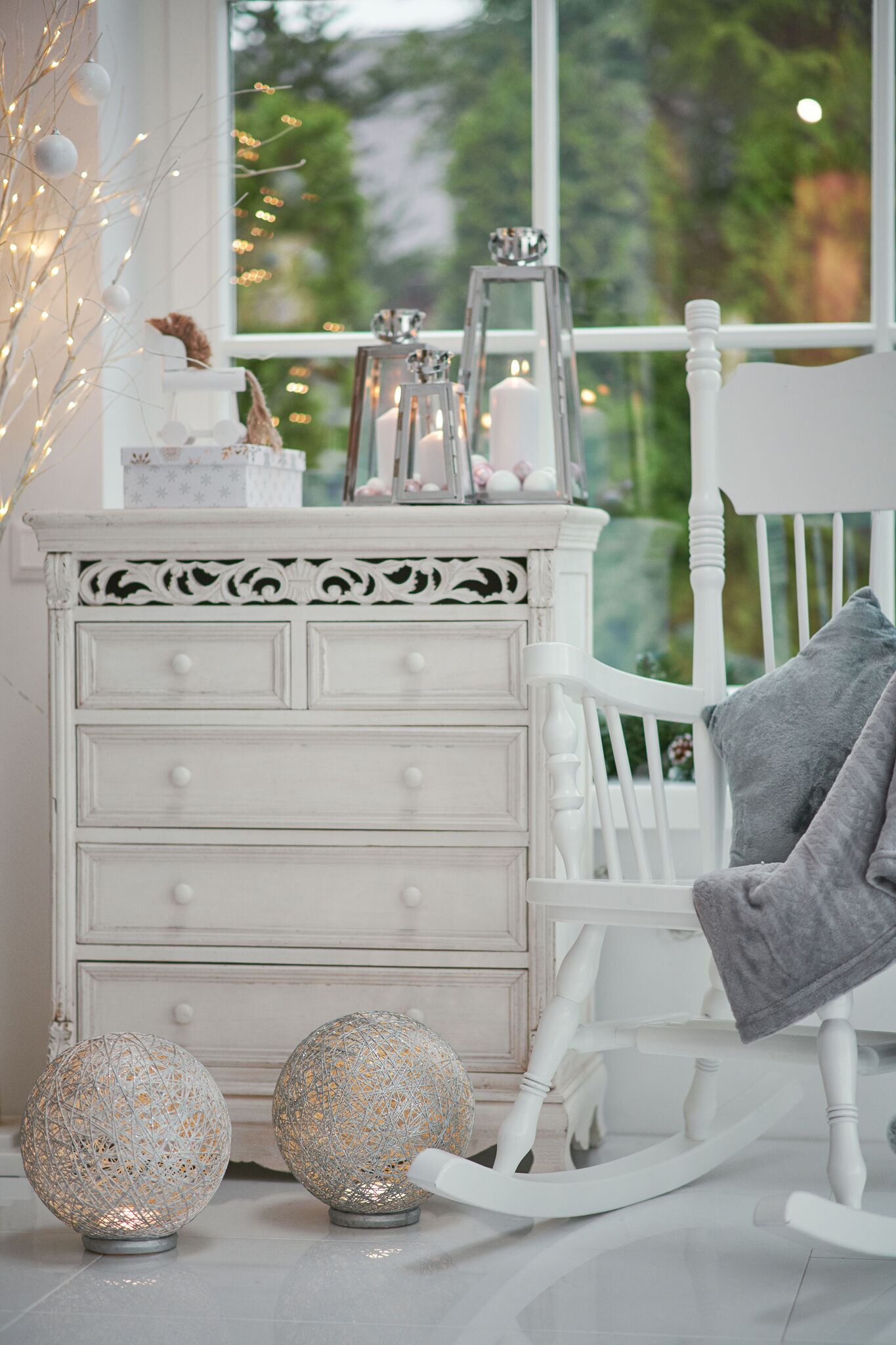 Nawiązujące do pozostałych dekoracji, dekoracje okienne dobrze jest oprzeć na grze światła. Bo światło i rzucane przez nie refleksy, to jeden z kluczowych elementów tego stylu. Zdecydowałam się na małe lampiony ze świeczką i bombkami. Taką aranżację okna możemy połączyć z ledowym łańcuchem lub wężem świetlnym. Zwróćcie uwagę na ledowy wąż świetlny, bo ta niepozorna dekoracja nie dosyć, że może być przeznaczona na zewnątrz, działa na baterie (czyli nie musimy się martwić o brak kontaktu na balkonie), to na dodatek wyposażona jest w sterownik, który umożliwia wybór aż 8 opcji świecenia.