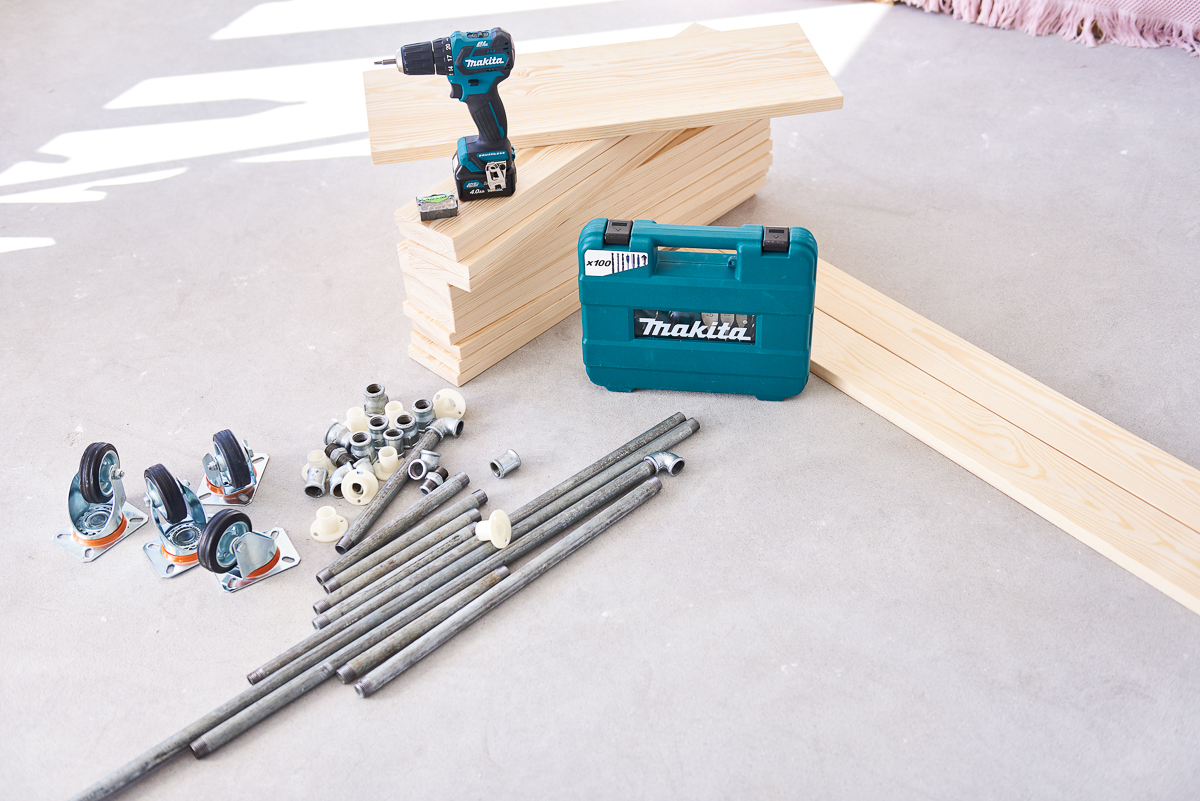 Budowę wieszaka zaczynamy od zrobienia podstawy. W tym celu układamy równolegle do siebie dwie najdłuższe deski, a następnie przywiercamy do nich kolejno każdą z 13 desek. Kolejnym etapem jest przymocowanie na każdym z czterech rogów podestu metalowych kółek (w tym wypadku polecam w szczególności metalowe kółka z możliwością blokady). Mając gotowy podest, możemy wziąć się za budowę konstrukcji wieszaka. Potrzebne nam będą w tym celu rozetki mocujące (które służą do przymocowania rurek do drewnianej konstrukcji), mufki hydrauliczne (które służą do łączenia poszczególnych rur) a także kolanka hydrauliczne (niezbędne do łączenia rur w przypadku konieczności ustawień prostopadłych). Łącząc poszczególne rurki hydrauliczne możemy zdecydować się na dodatkowe miejsce na półki po każdej ze stron wieszaka. Wszystko zależy od naszych potrzeb i wyobraźni!