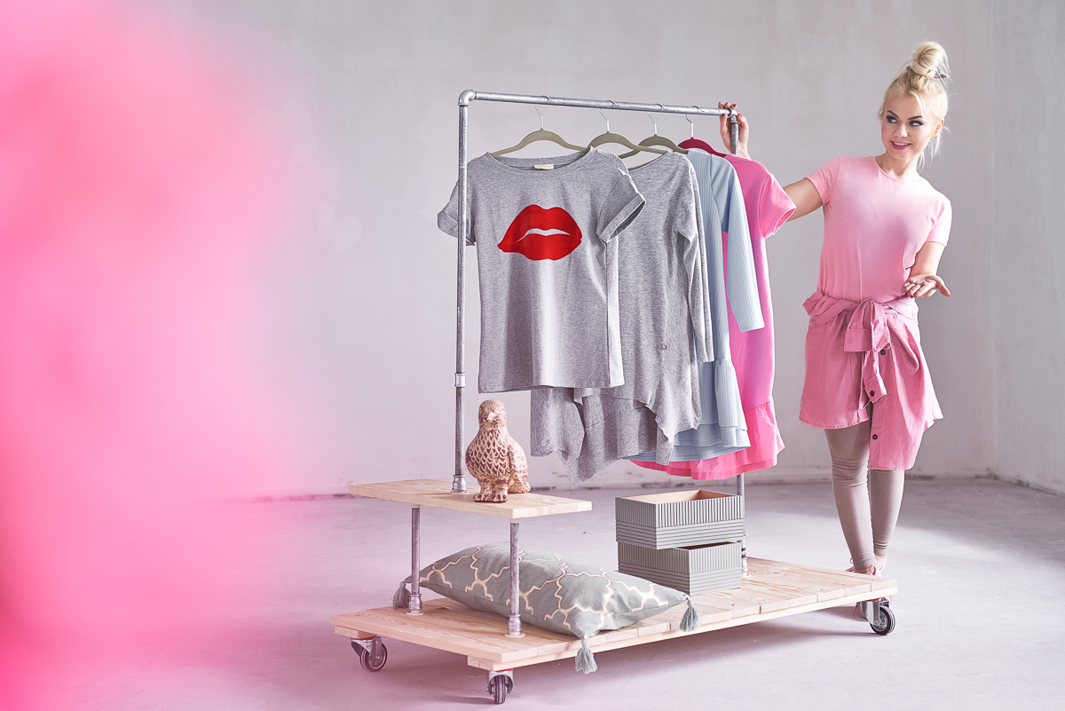 Jedno jest pewne! W przypadku ubrań, potrzebujemy sprytnych, funkcjonalnych i praktycznych rozwiązań. Najlepiej takich, które możemy przemieszczać w celu posprzątania a także swobodnie przesunąć w przypadku chęci prze-aranżowania wnętrza. Wyobrażam sobie, że moja propozycja przypadnie do gustu szczególnie indywidualistom, którzy mieszcząc swoją garderobę na mobilnym wieszaku, wyrażą swój sprzeciw wobec obrastaniu w wciąż nowe ubrania. Jest to również doskonałe rozwiązanie dla ubrań sezonowych. Wieszak gwarantuje przejrzysty podgląd odzieży i szybki dobór poszczególnych jej elementów.