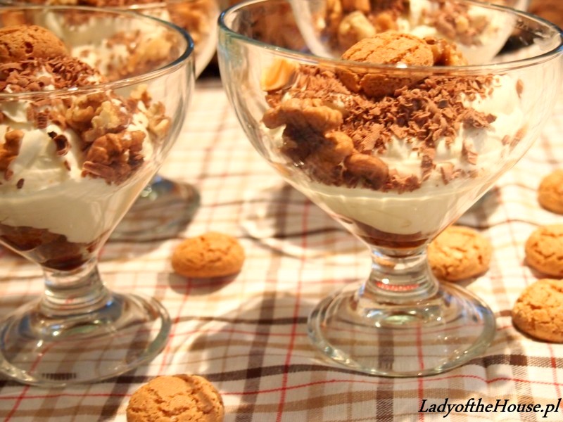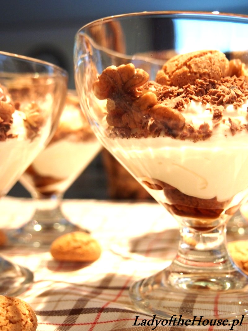 Kolejne piętro tworzy nasza ubita masa. A zwieńczeniem całego deseru jest starta tabliczka czekolady w połączeniu z orzechami włoskimi i biszkopcikami “amaretti”.
