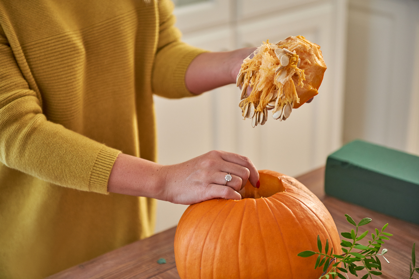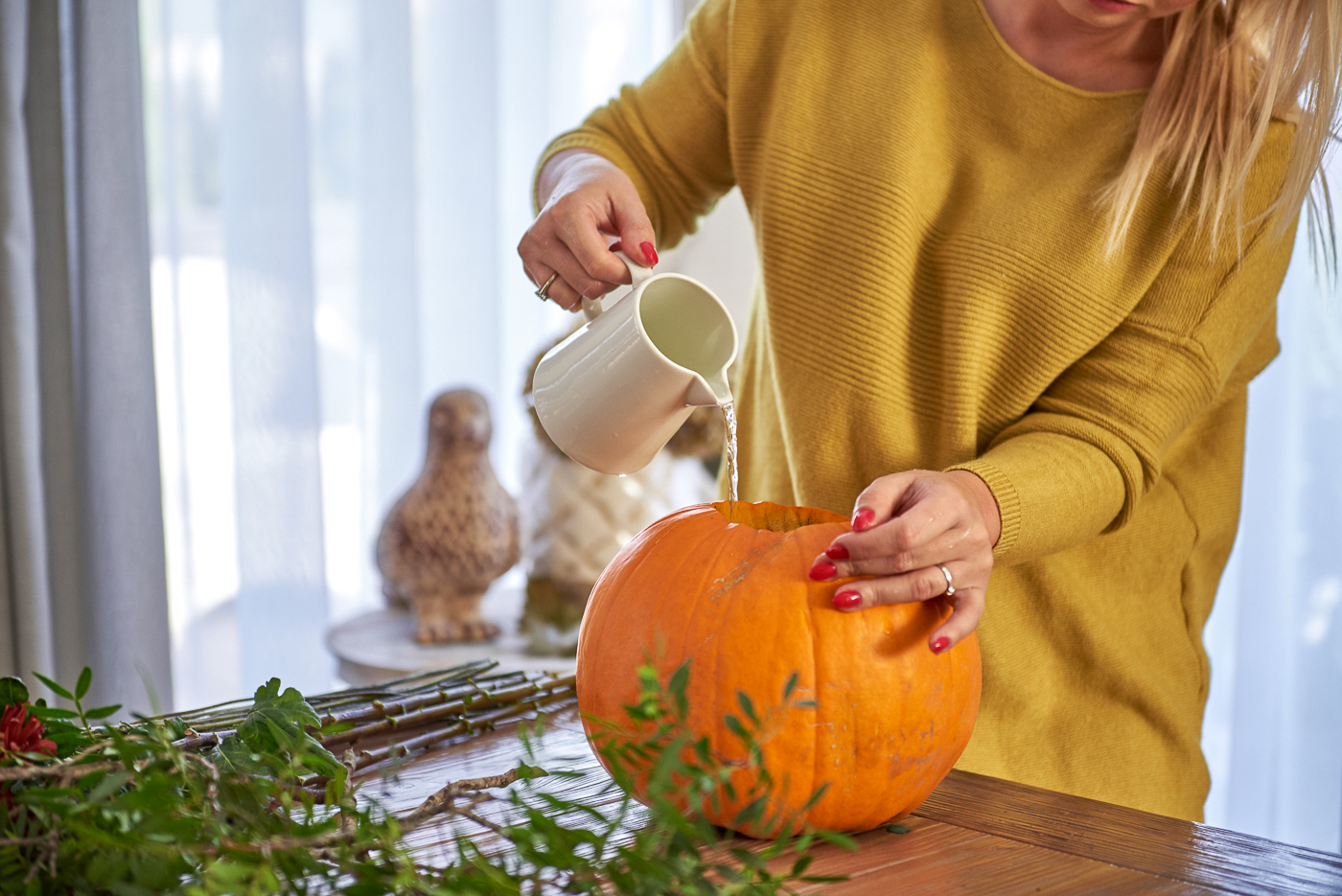 Ja bym jednak namoczyła gąbkę przed włożeniem do dyni. Tak podlana nie pobierze całą powierzchnią wody.