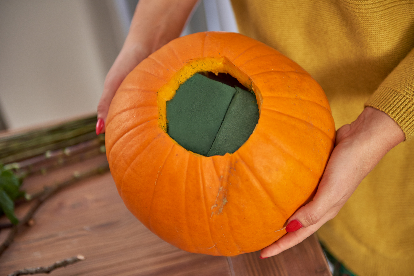 Niegdyś podobny wazon wykonałam, wkładają do niego doniczkę wypełnioną gąbką a także w wersji folii pod gąbką florystyczną. Wersja z gąbką ułożoną bezpośrednio w dyni sprawdza się doskonale i najdłużej podtrzymuje świeżość bukietu.