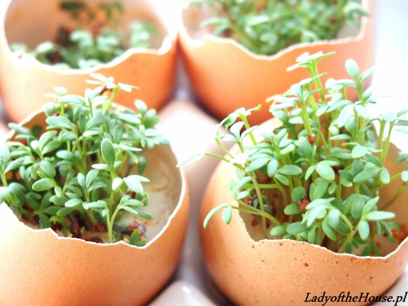 Do wykonania ozdób wykorzystałam: skorupki jajek, nasionka rzeżuchy, watę, wodę i mech (na podkładkę).